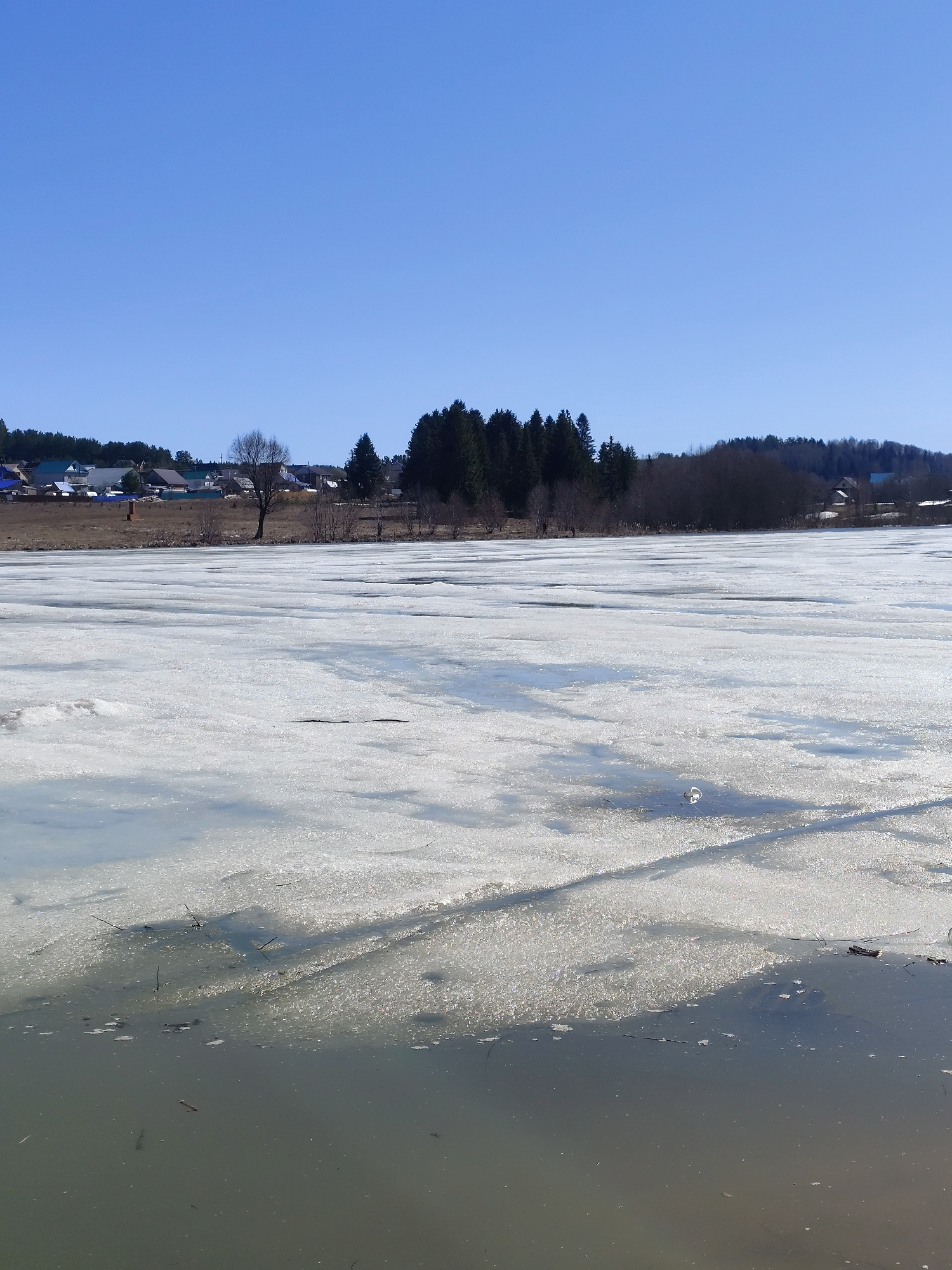 The image depicts a partially frozen lake in the city of Фоки, Russia. The foreground shows murky water with some debris floating on the surface. The middle ground reveals a large expanse of ice and s…read more