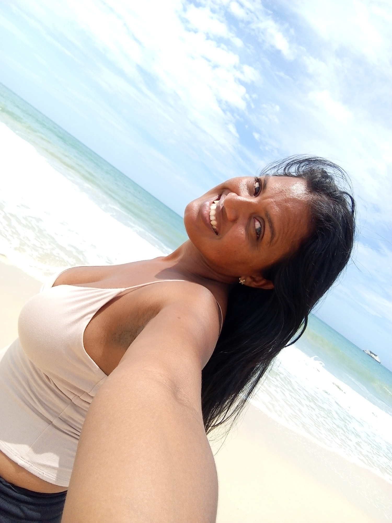 A woman is taking a selfie on a beach. The background includes a sunny sky with some clouds, the ocean with waves, and the sandy beach. The exact location in Altagracia, Venezuela, cannot be determine…read more