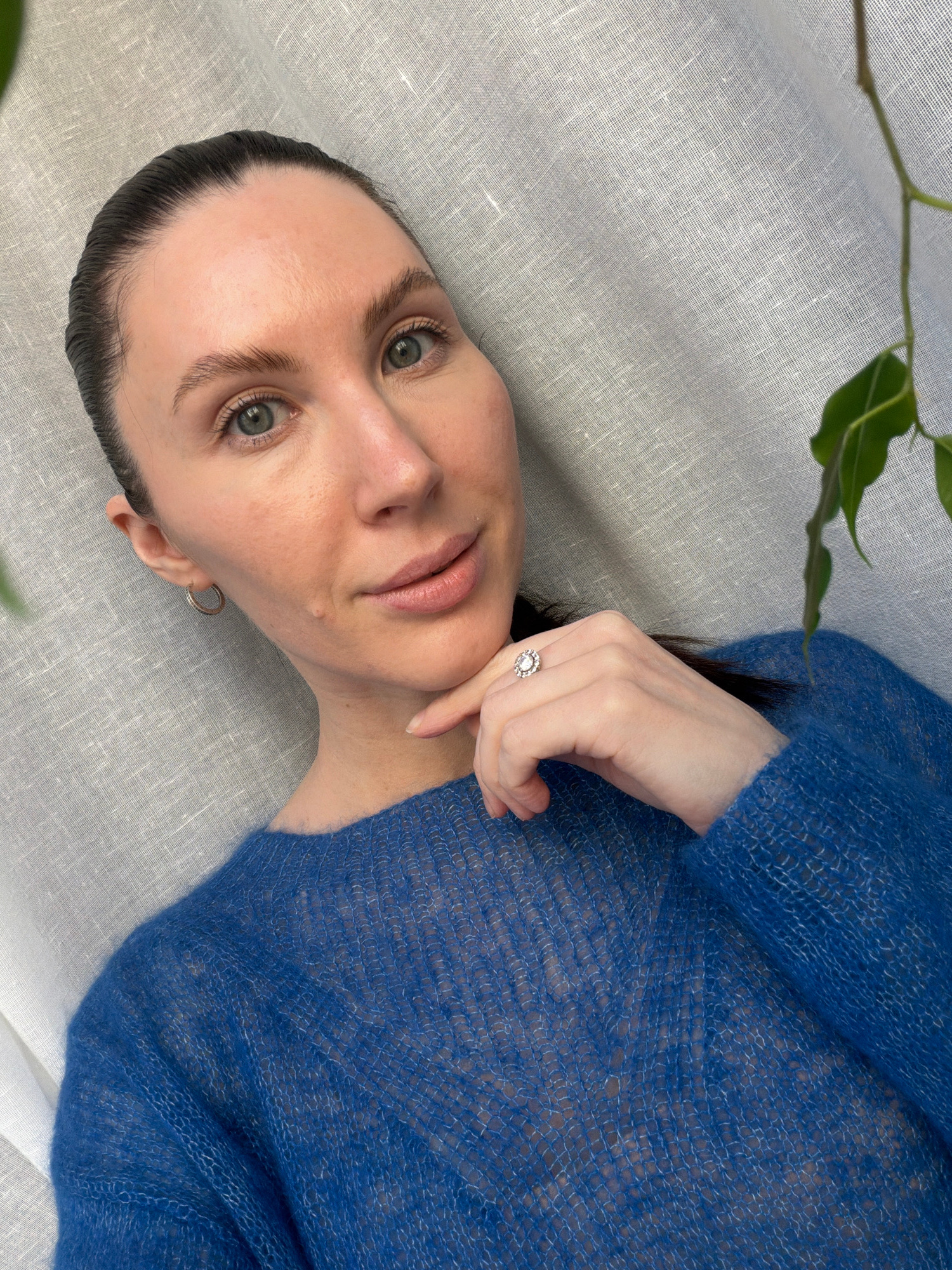 A woman lies on a textured white fabric, wearing a sheer blue sweater. Her hand, adorned with a ring, rests near her face. A leafy branch enters the frame at the top left. She wears a silver hoop earr…read more