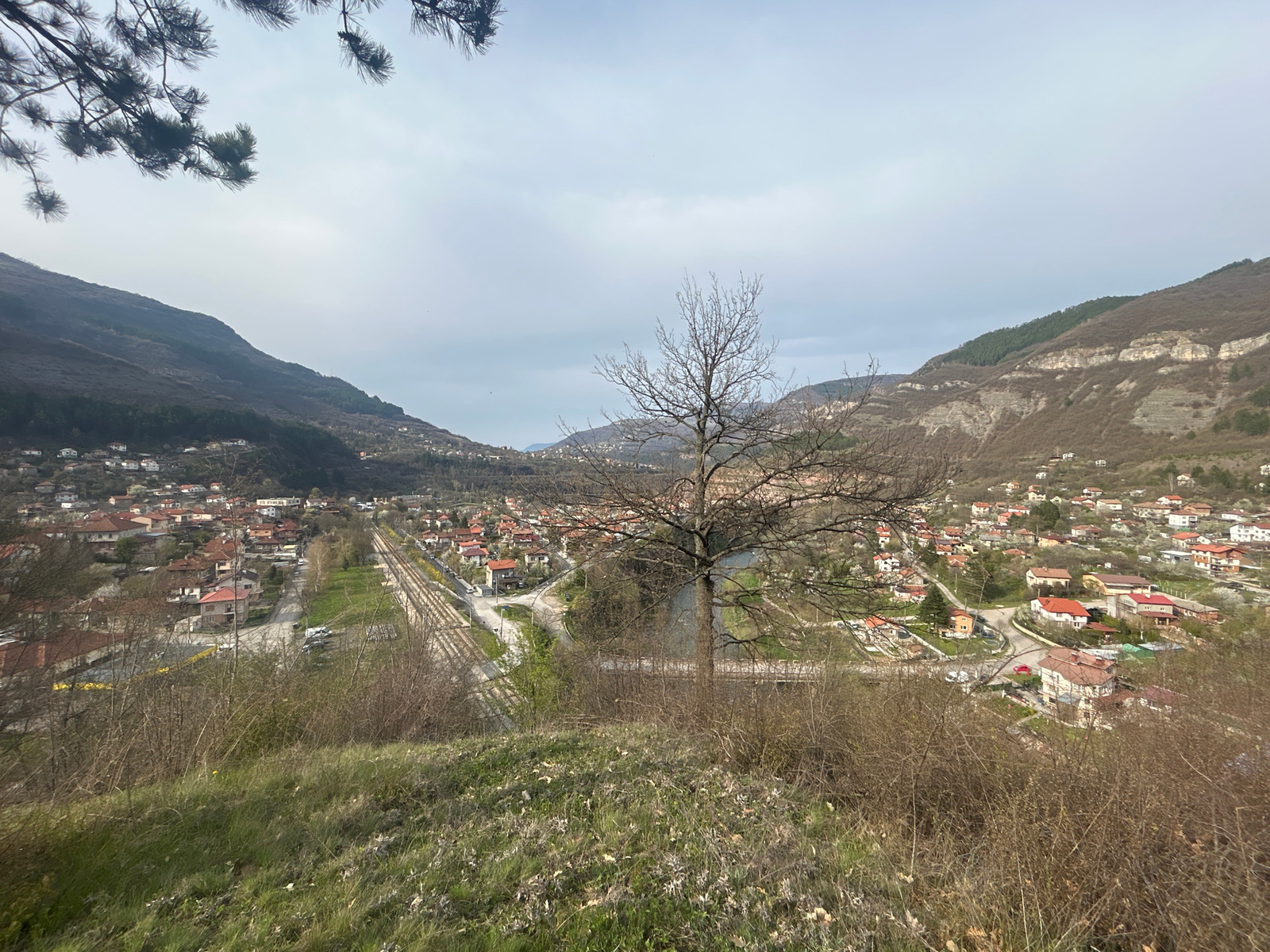 The image shows a view of the town of Tserovo, Bulgaria, nestled in a valley between hills. A leafless tree stands prominently in the foreground, partially obscuring the view. Below the hill, the town…read more