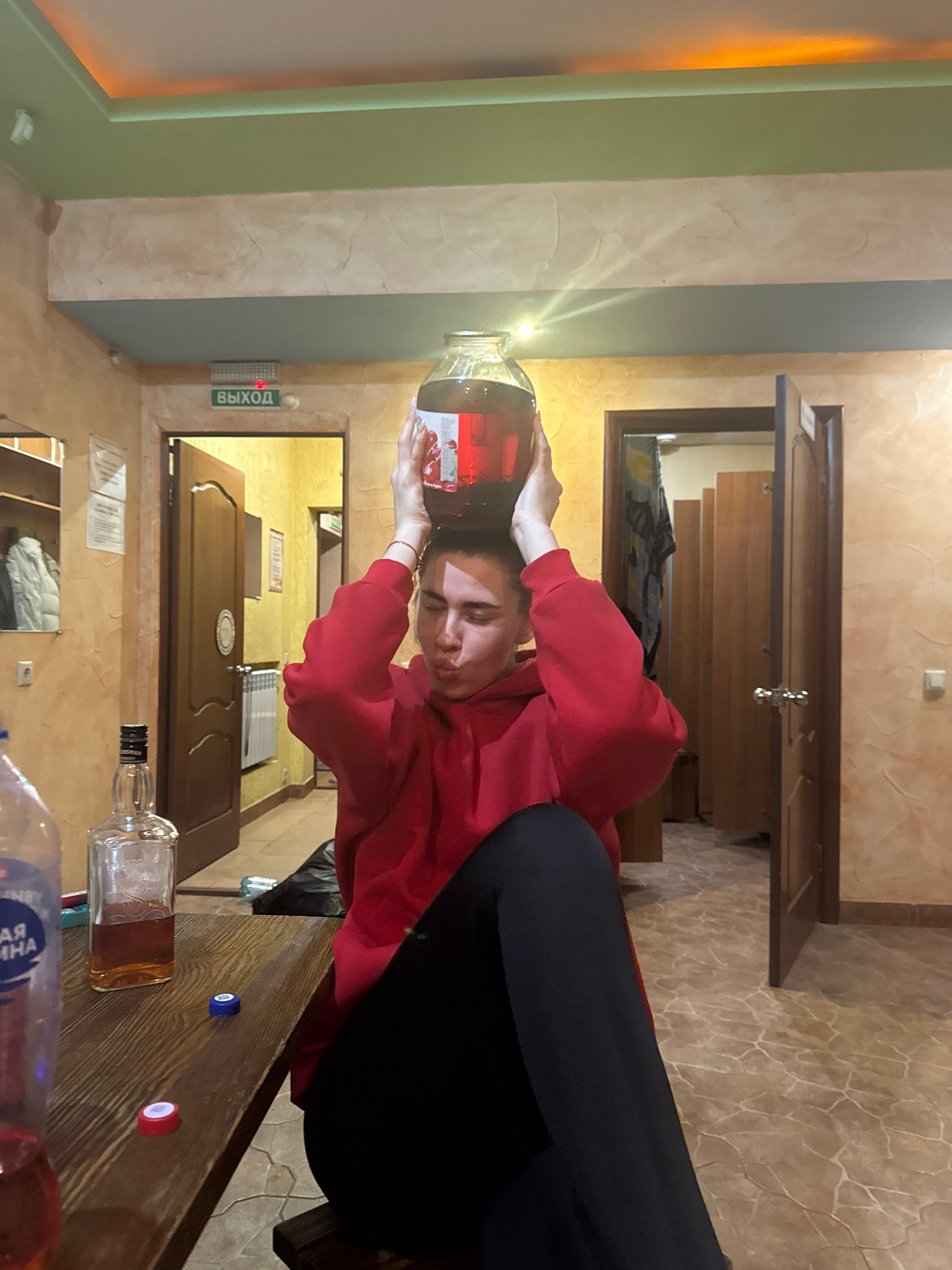 The photograph captures a scene inside an establishment in Chaikovsky, Russia. A young adult is centered in the image, holding a large jar filled with a red liquid above their head with both hands. Th…read more