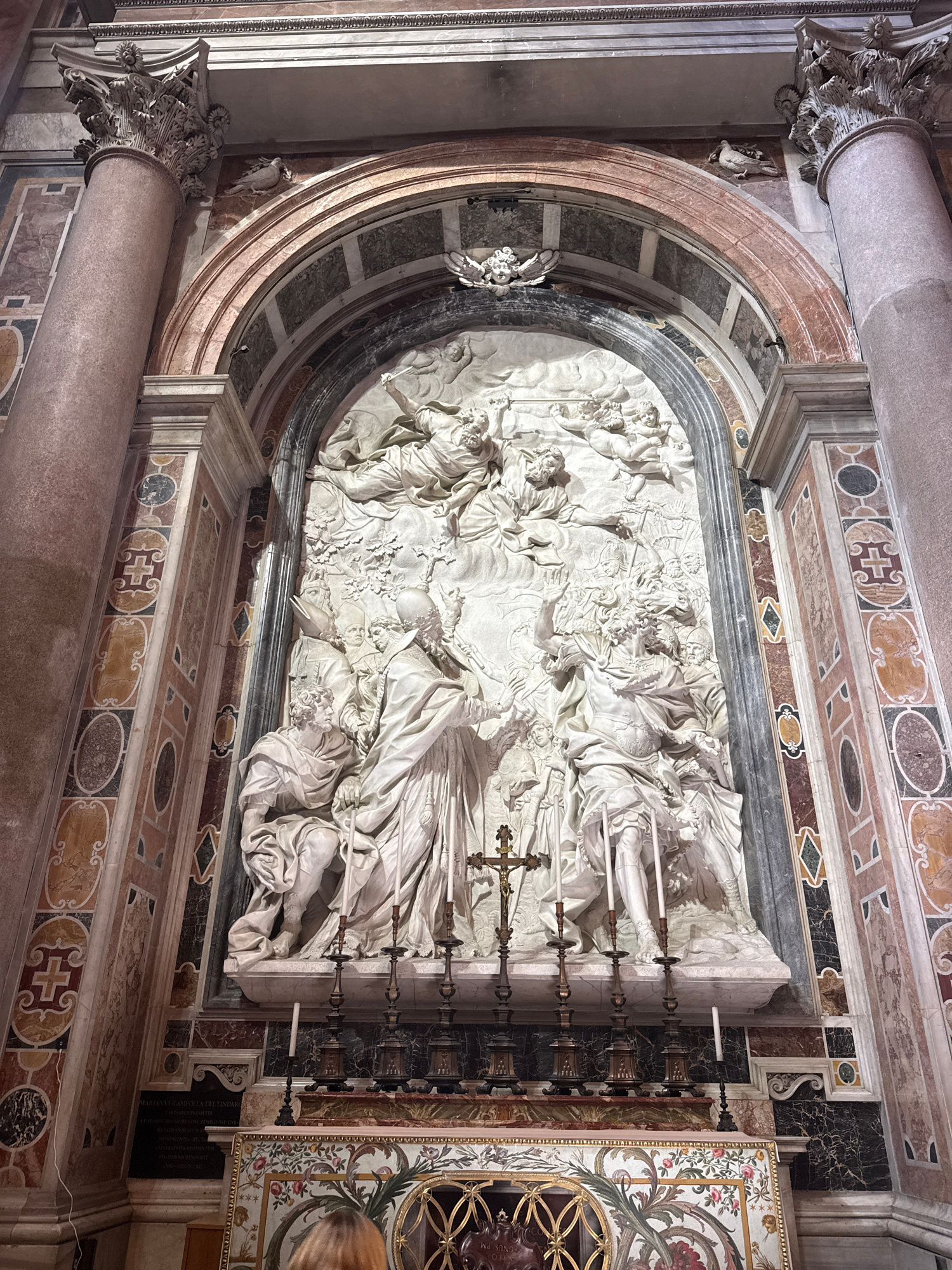 The image depicts the funerary monument of Maria Flaminia Chigi in St. Peter's Basilica, Città del Vaticano, Vatican City. The monument features a white marble relief sculpture set within a decorative…read more
