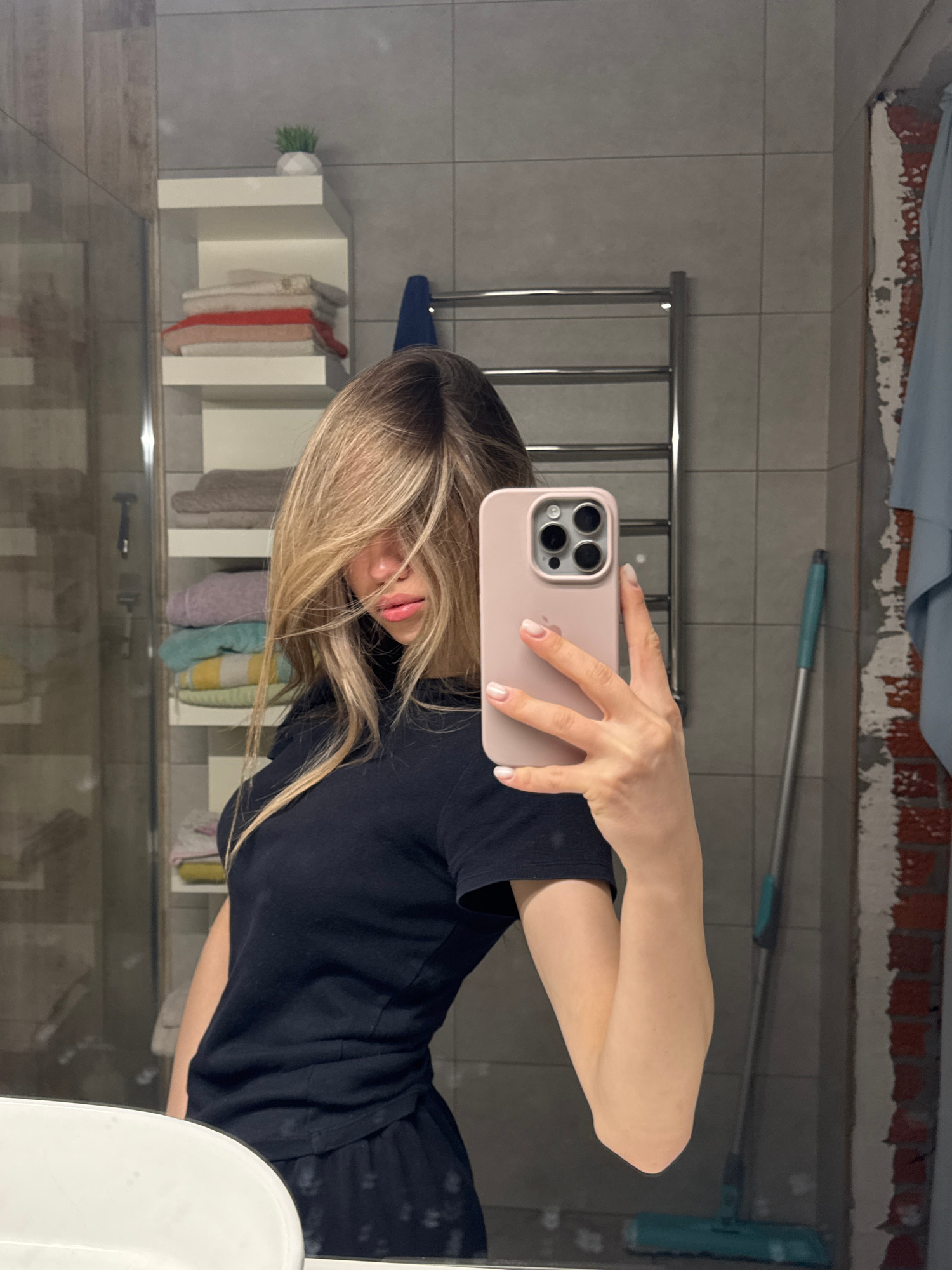 A person with blonde hair is taking a selfie in a bathroom. The bathroom has grey tiled walls, a towel rack, a shelf with towels, and a mop leaning against the wall. The person is holding a pink iPhon…read more