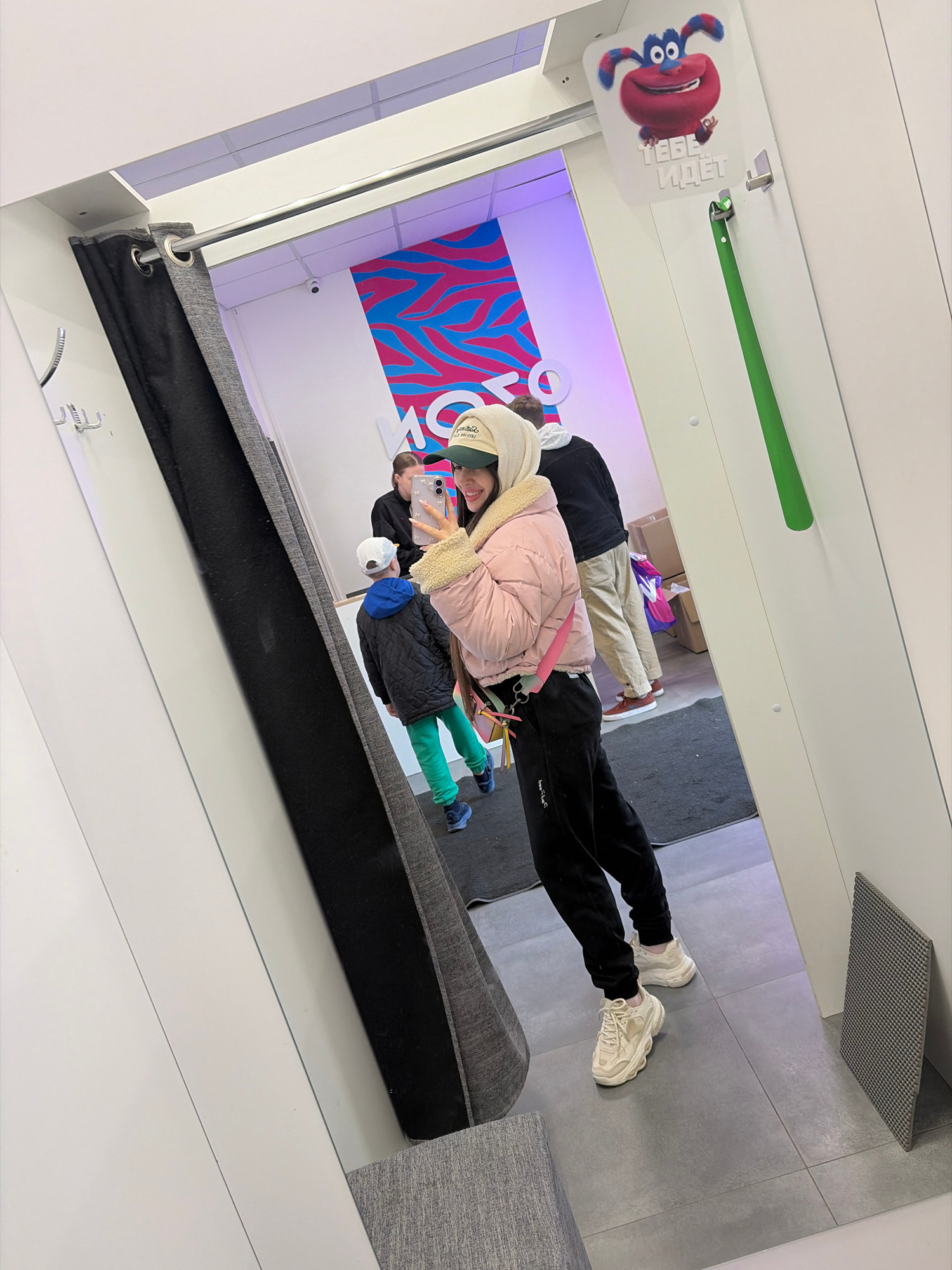 The image depicts a group of people inside a mirror room. A woman in a pink jacket is taking a picture in a mirror. The room has a colorful wall design and a cartoon sign. The location is identified a…read more
