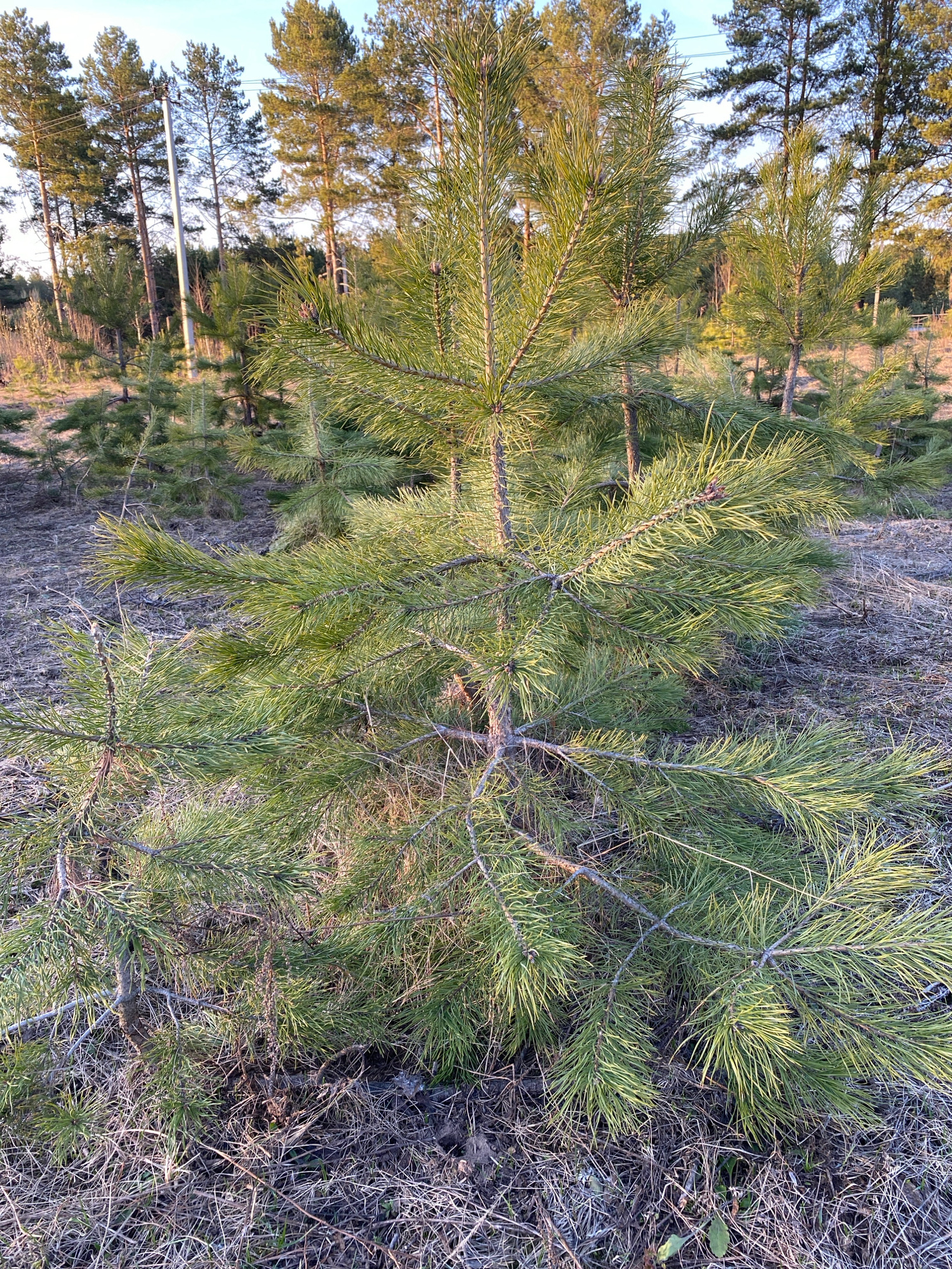 The image captures a sunlit natural scene, likely a pine forest or plantation, in Chaikovsky, Russia. The foreground is dominated by the branches and bright green needles of a young pine tree, appeari…read more