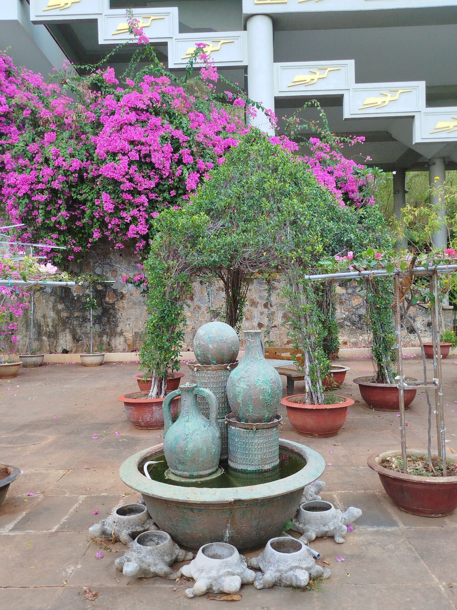 The image depicts a garden scene with a central water fountain in what is likely a public or private garden setting in Ho Chi Minh City, Vietnam. The fountain consists of a large, weathered, circular…read more