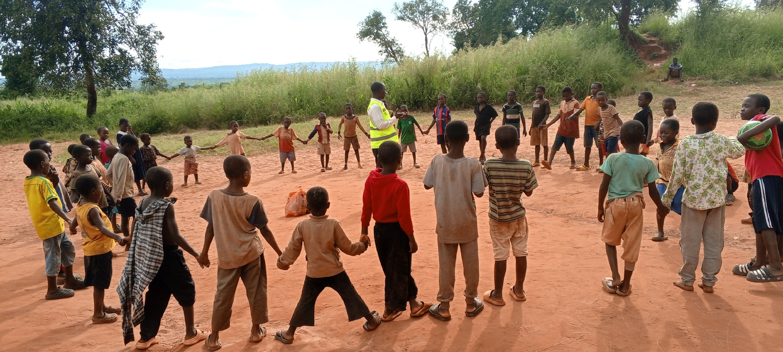 A group of children, seemingly in the city of Ngalula, Democratic Republic of the Congo, are standing in a circle on a red dirt ground. An adult, wearing a yellow reflective vest, stands near one side…read more