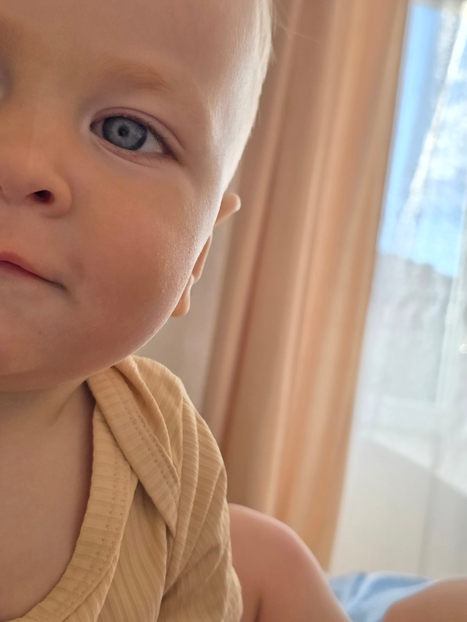 A close-up photograph captures a baby with blue eyes, wearing a yellow ribbed shirt, lying indoors. The scene features a window in the background, suggesting daylight. The image focuses primarily on t…read more