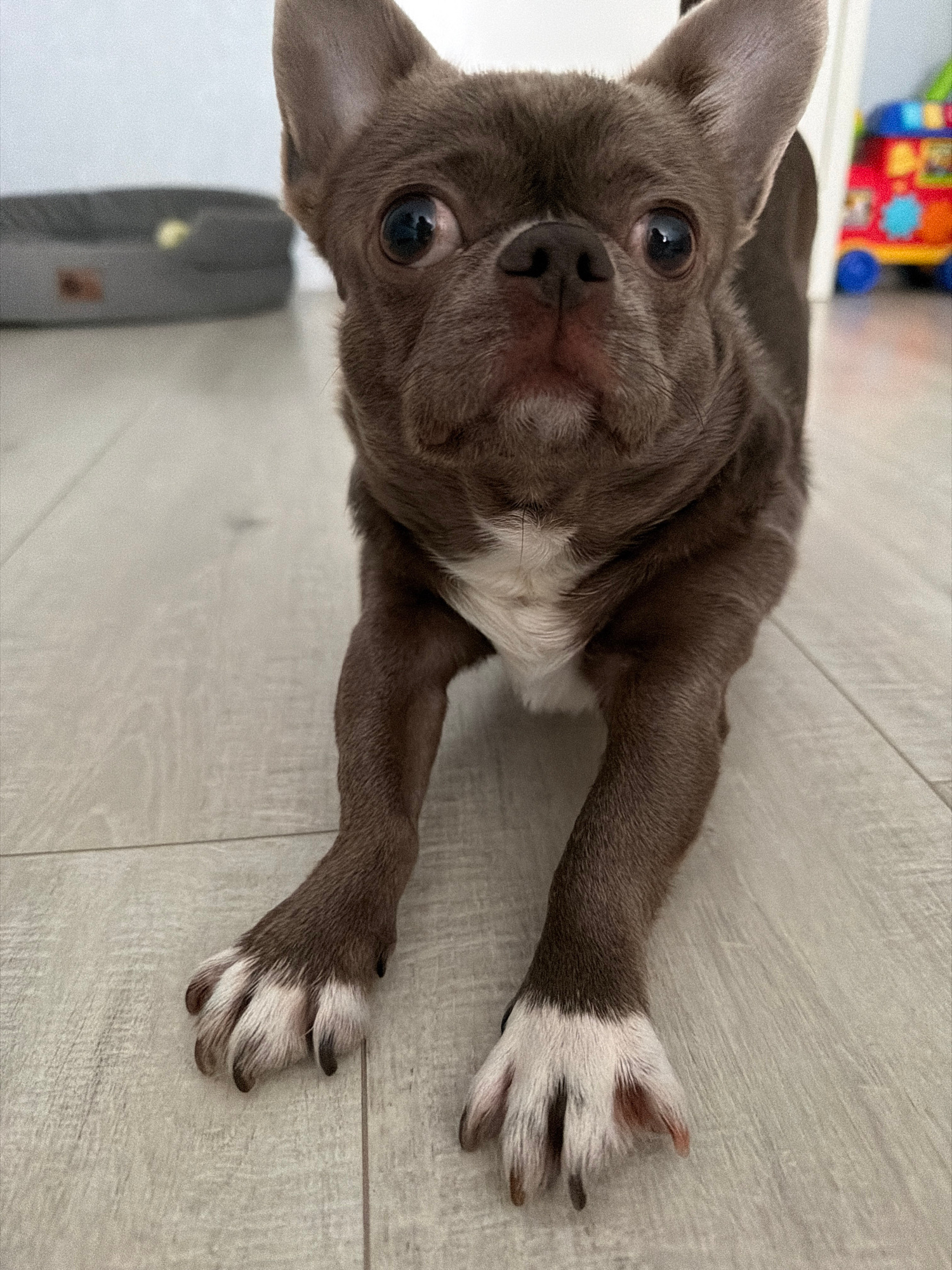 A brown Chihuahua with white paws lies on a light grey tile floor. The dog is facing the camera and has a white patch on its chest. A grey air purifier is visible in the bottom left corner of the fram…read more