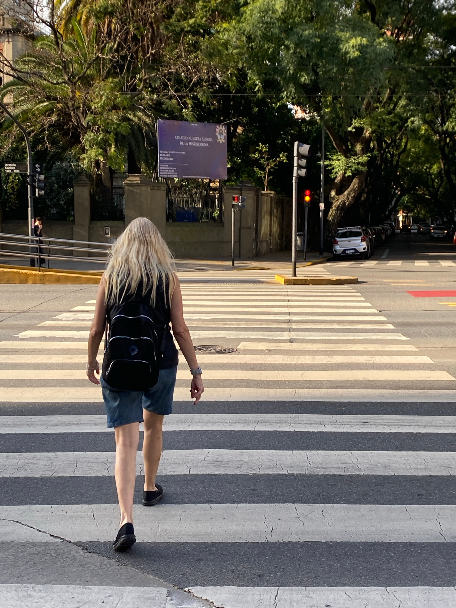 A woman with blonde hair walks across a zebra crossing. She wears a dark shirt and dark shorts, a black backpack, and dark shoes. She is heading away from the camera. Behind her is a sign that says "Cā¦read more