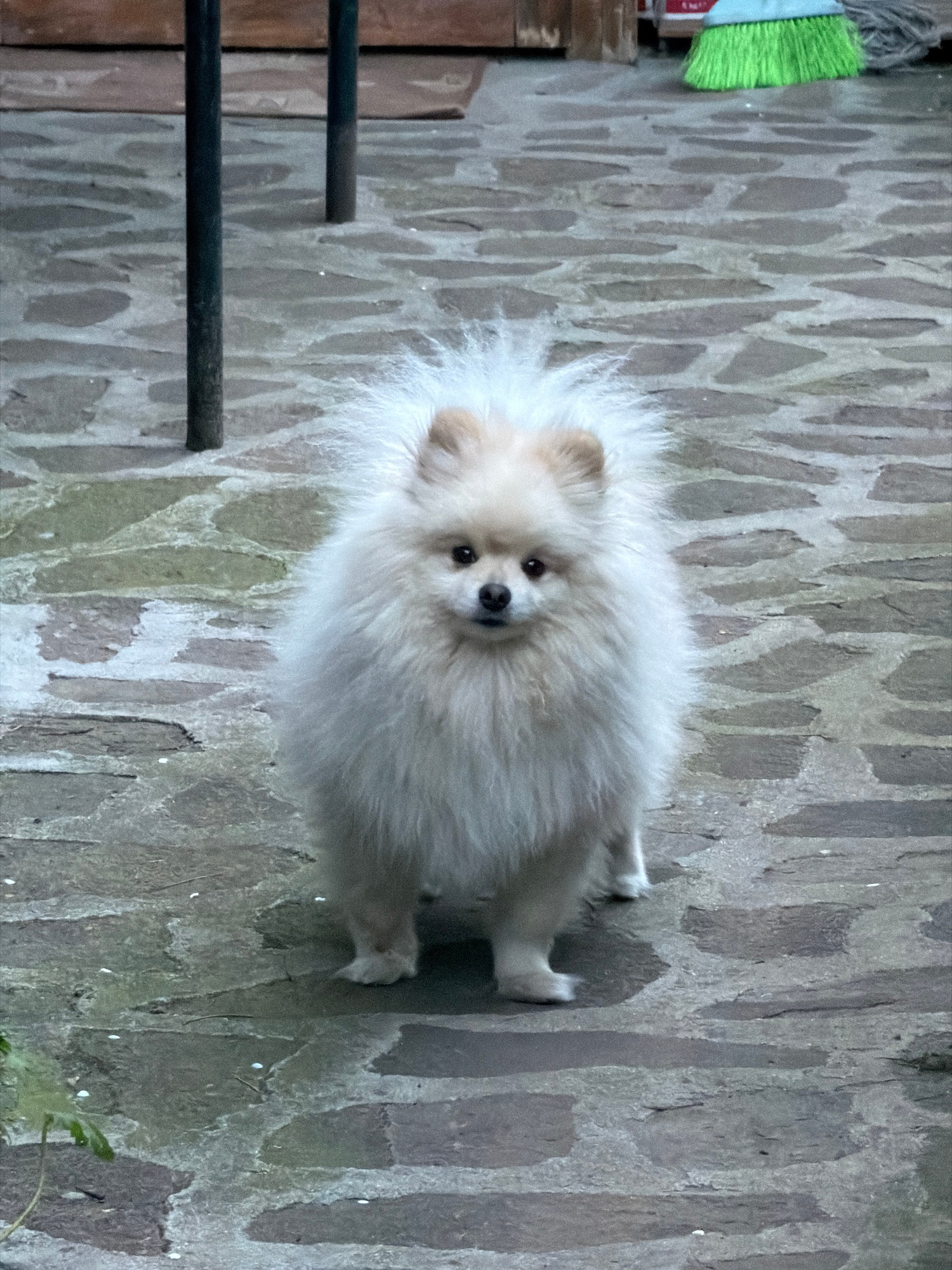 A medium shot depicts a small, fluffy, white Pomeranian dog standing on a paved surface. The pavement consists of irregularly shaped stones of various shades of gray and brown. A railing with black ba…read more