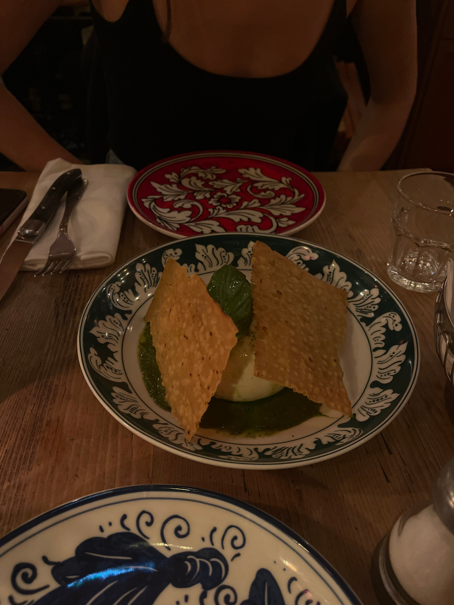 The image shows a dining table in what appears to be a restaurant setting. The focus is on a plate containing food, specifically what looks like two square crackers served with a white, creamy substan…read more