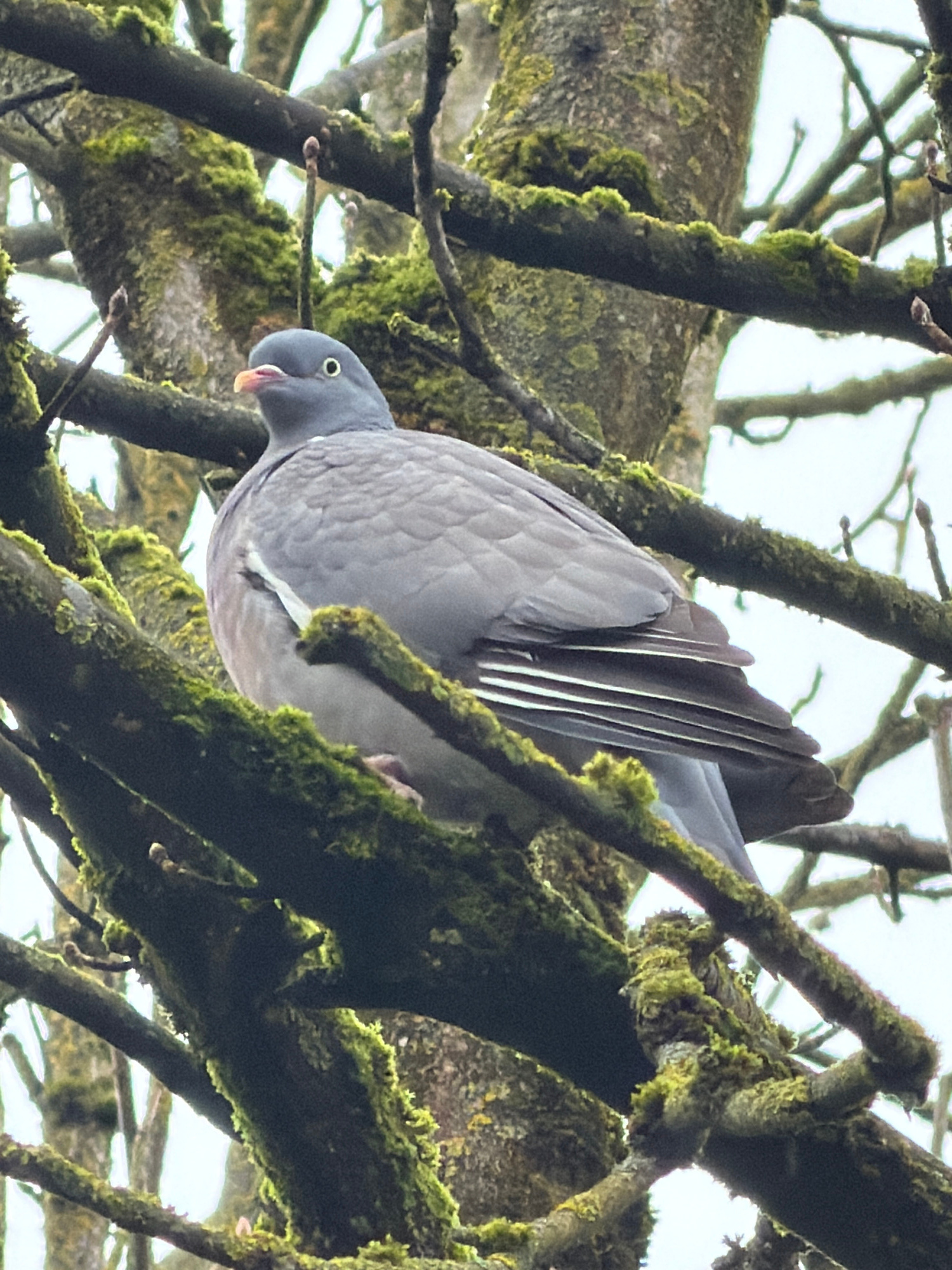 A Common Wood Pigeon (Columba palumbus) is depicted perched on a moss-laden branch within a deciduous tree in Esch-sur-Alzette, Luxembourg. The bird, occupying the central-right of the frame, presents…read more