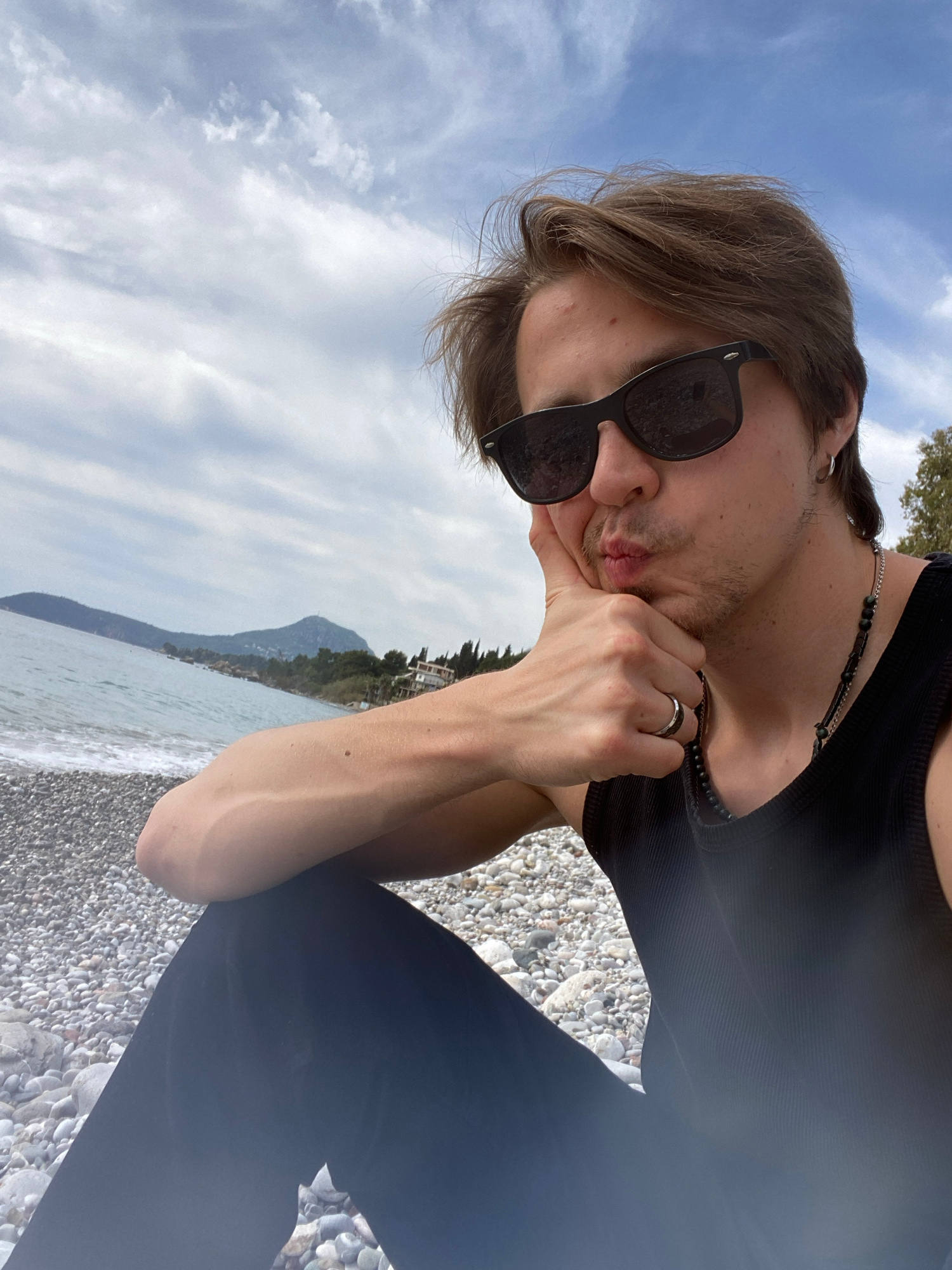 A young, light-skinned male with brown hair and sunglasses is on a pebble beach in Bar, Montenegro. He's wearing a black tank top, black pants, and a beaded necklace. His face rests on his hand, displ…read more