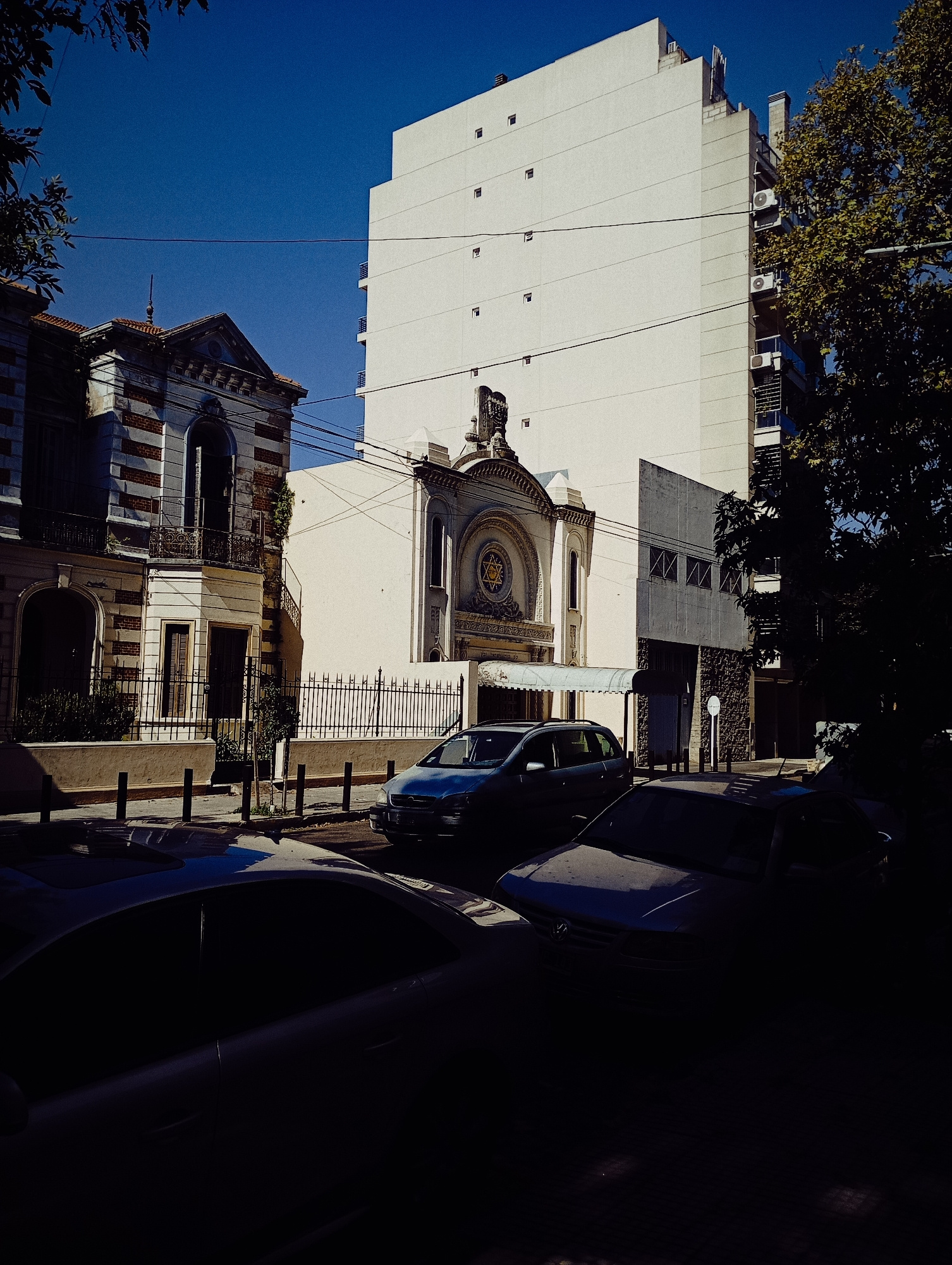 The image captures a street scene in Buenos Aires, Argentina, featuring a stark juxtaposition of architectural styles. The main subjects are three buildings: a decaying, two-story building with red br…read more
