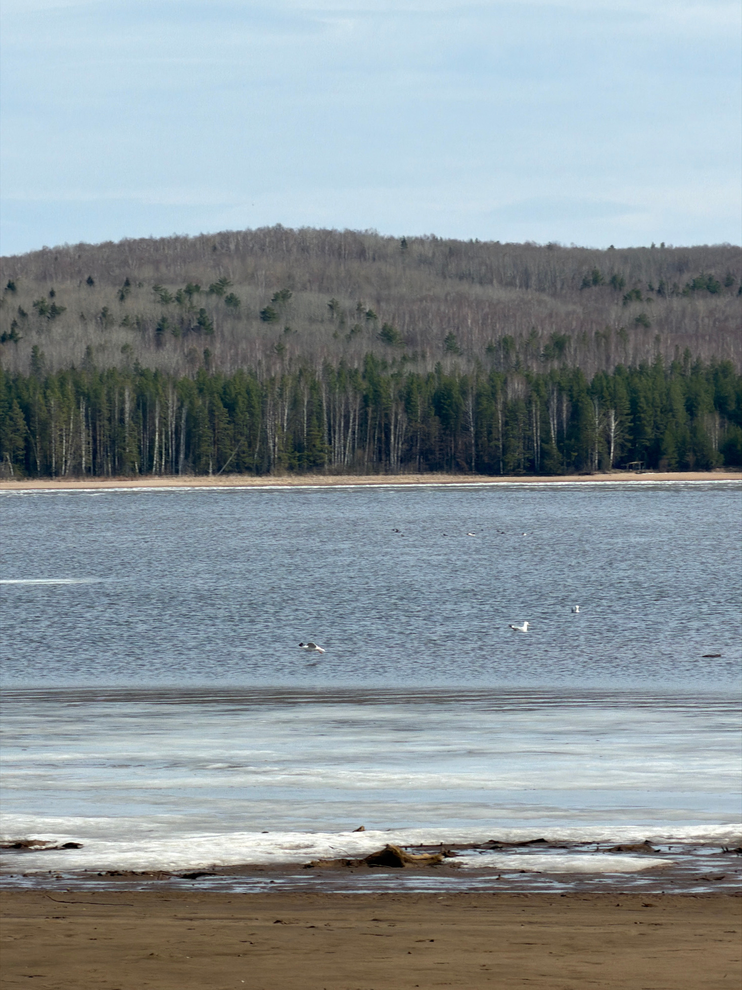 The image depicts a landscape featuring a body of water, a shoreline, and a forest. The water, likely a lake or a wide river, occupies a significant portion of the scene. Several birds are visible fly…read more