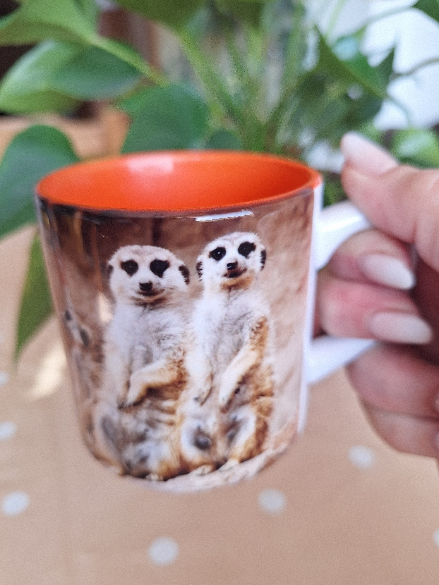 A person's hand, with light-colored, well-manicured nails, holds a mug by its white handle. The image is oriented with a 90-degree clockwise rotation. The mug features a bright orange interior. Its ex…read more
