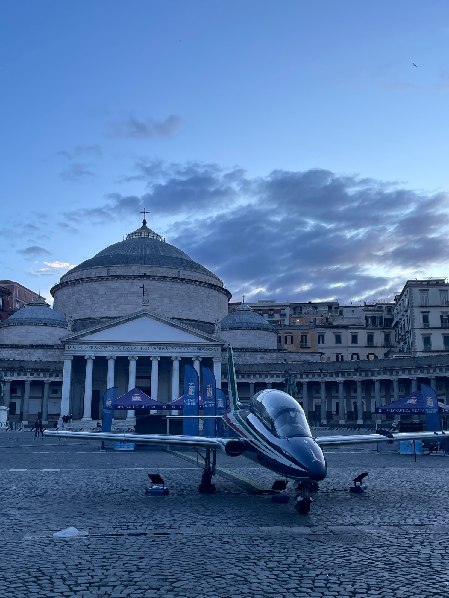 The image displays a static display of a single-engine, two-seat jet aircraft, likely an Aermacchi MB-339, on the cobblestone surface of Piazza del Plebiscito in Naples, Italy. The aircraft is predomi…read more