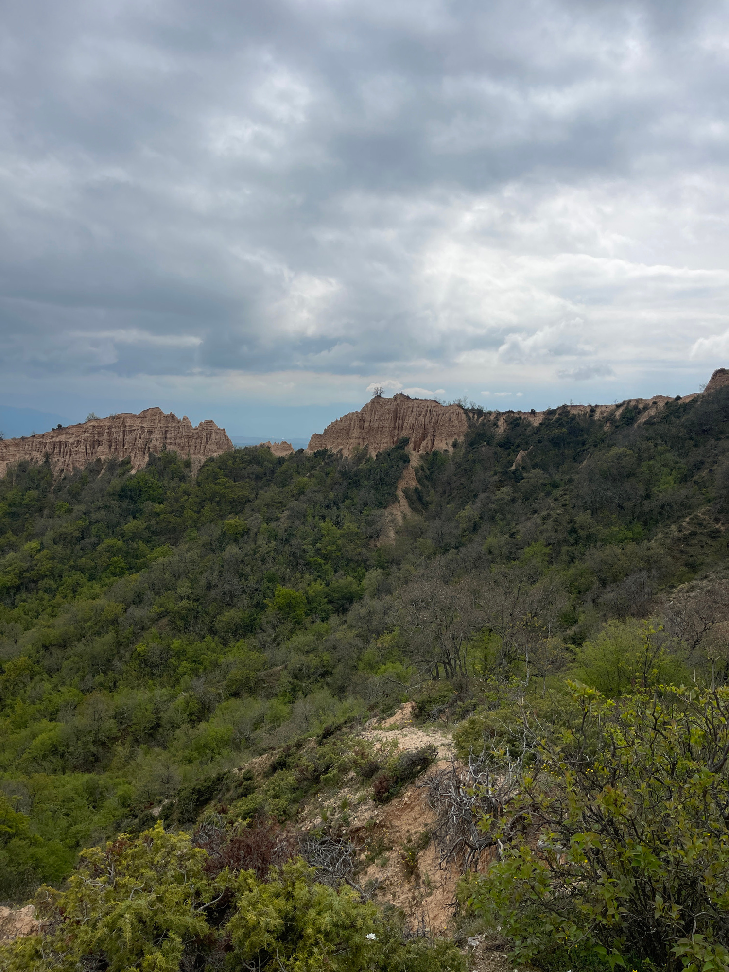 The image depicts a landscape near Rozhen, Bulgaria, featuring eroded sandstone formations. The scene is composed of two main elements: the sky and the terrain. The sky, taking up roughly half the fraβ¦read more