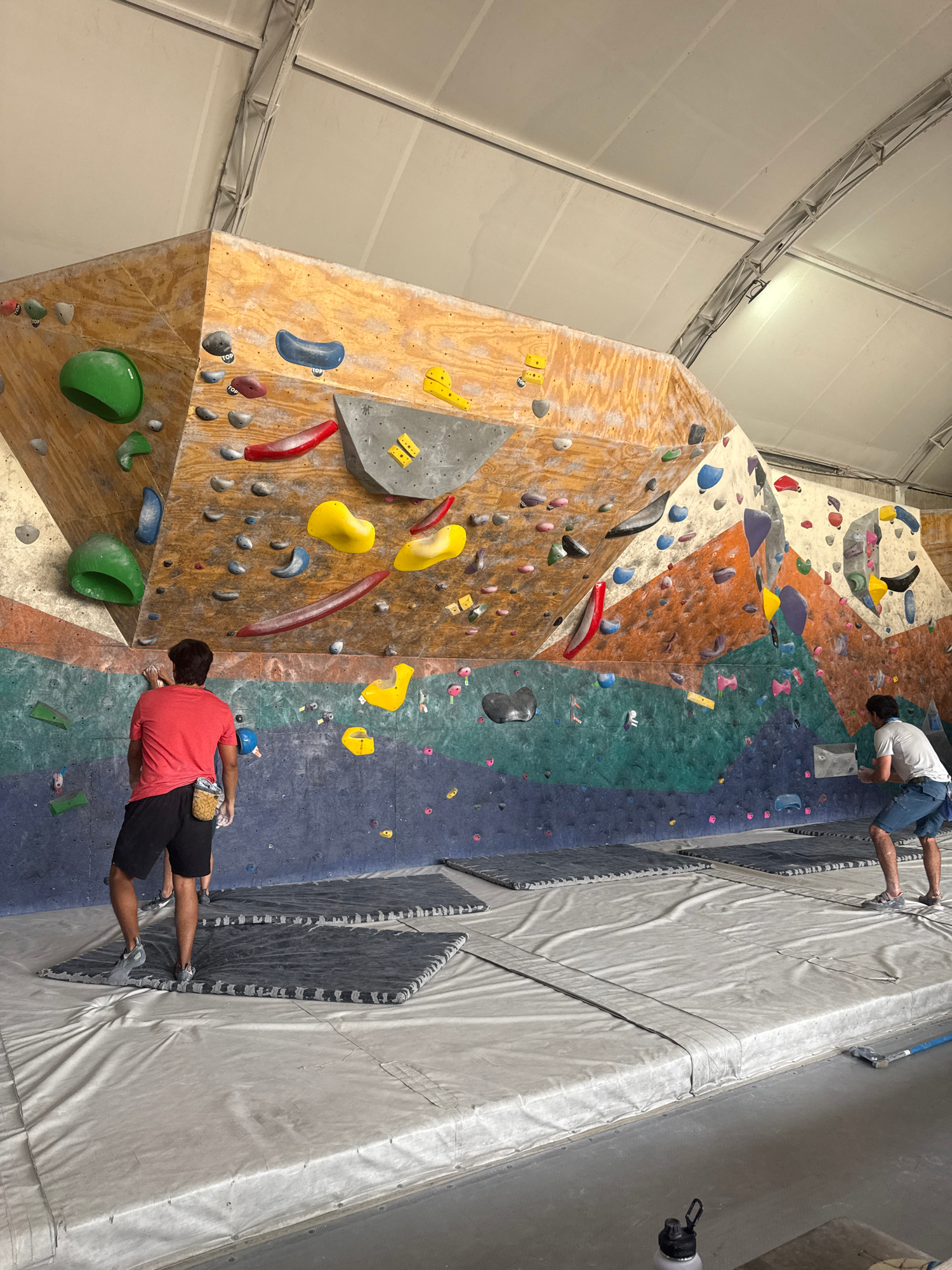 A climbing gym in San Andrés Cholula, Mexico shows two people climbing an indoor rock wall. The wall is multi-colored with various climbing holds attached to different sections. One climber wears a re…read more