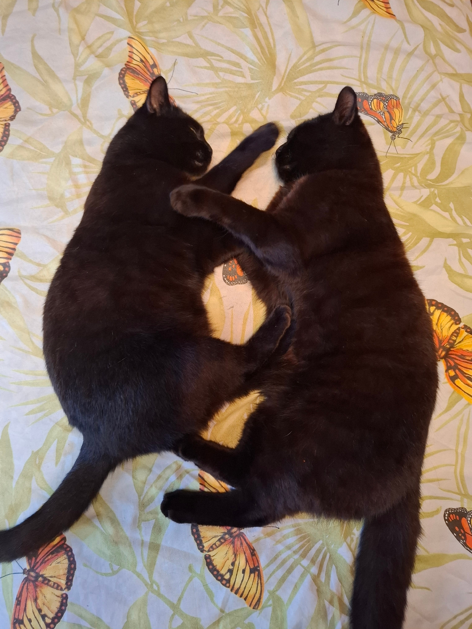 Two black cats are lying on a bedspread with a butterfly and leaf pattern. One cat is lying on its back, while the other is lying on top of it. The location is not specified, so Khlevnoye, Russia cann…read more