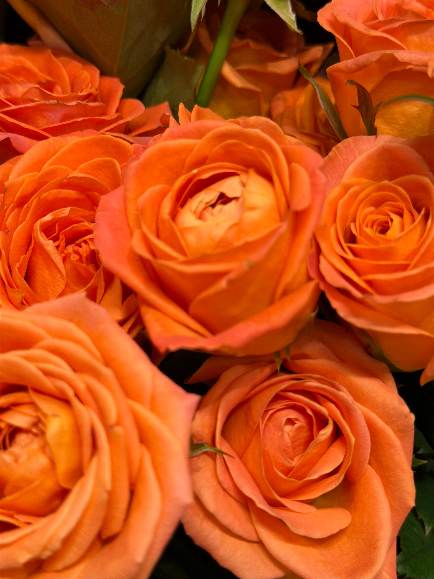 This close-up image captures a vibrant bouquet of orange roses. The scene is dominated by several blooming roses, filling most of the frame. The subjects are the individual roses, with their layered p…read more