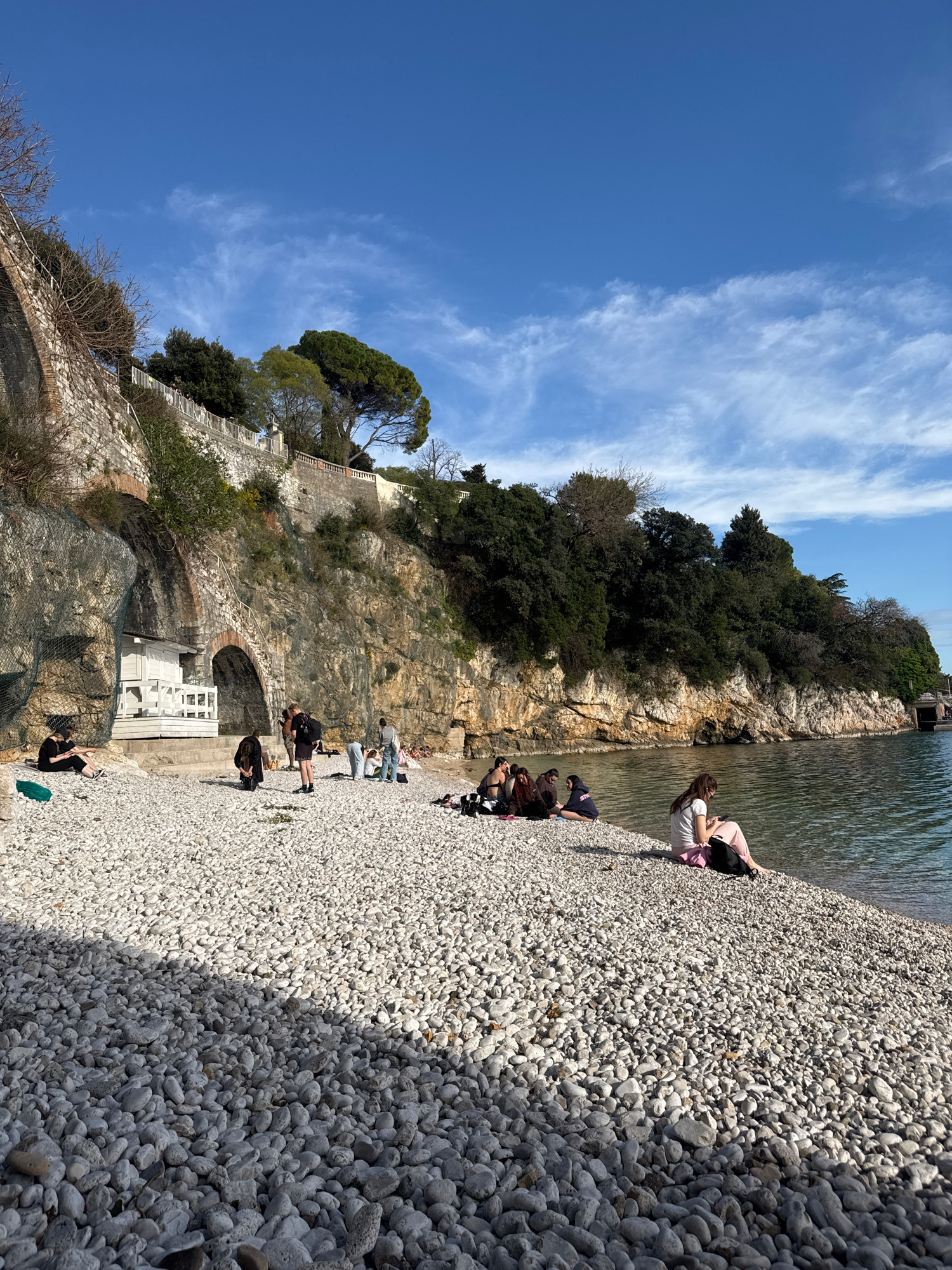 The image shows a coastal scene in the city of Grad Rijeka, Croatia, with a pebble beach in the foreground. Several people are present, engaging in activities such as sitting, standing, or walking alo…read more