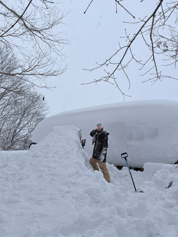 A low-angle shot reveals a snowy scene. A snowboarder, dressed in dark winter gear and light-colored pants, stands near the edge of a snow-covered cliff. A shovel is stuck in the snow nearby. Bare tre…read more