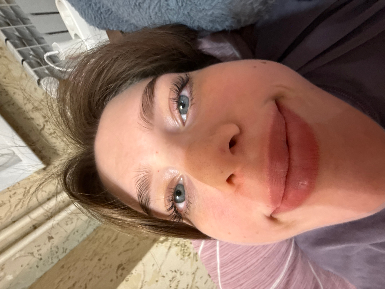 A close-up, tilted selfie depicts a woman with light skin, light brown hair, and blue eyes. She is smiling slightly, looking directly at the camera. The background includes a wall with light-colored p…read more
