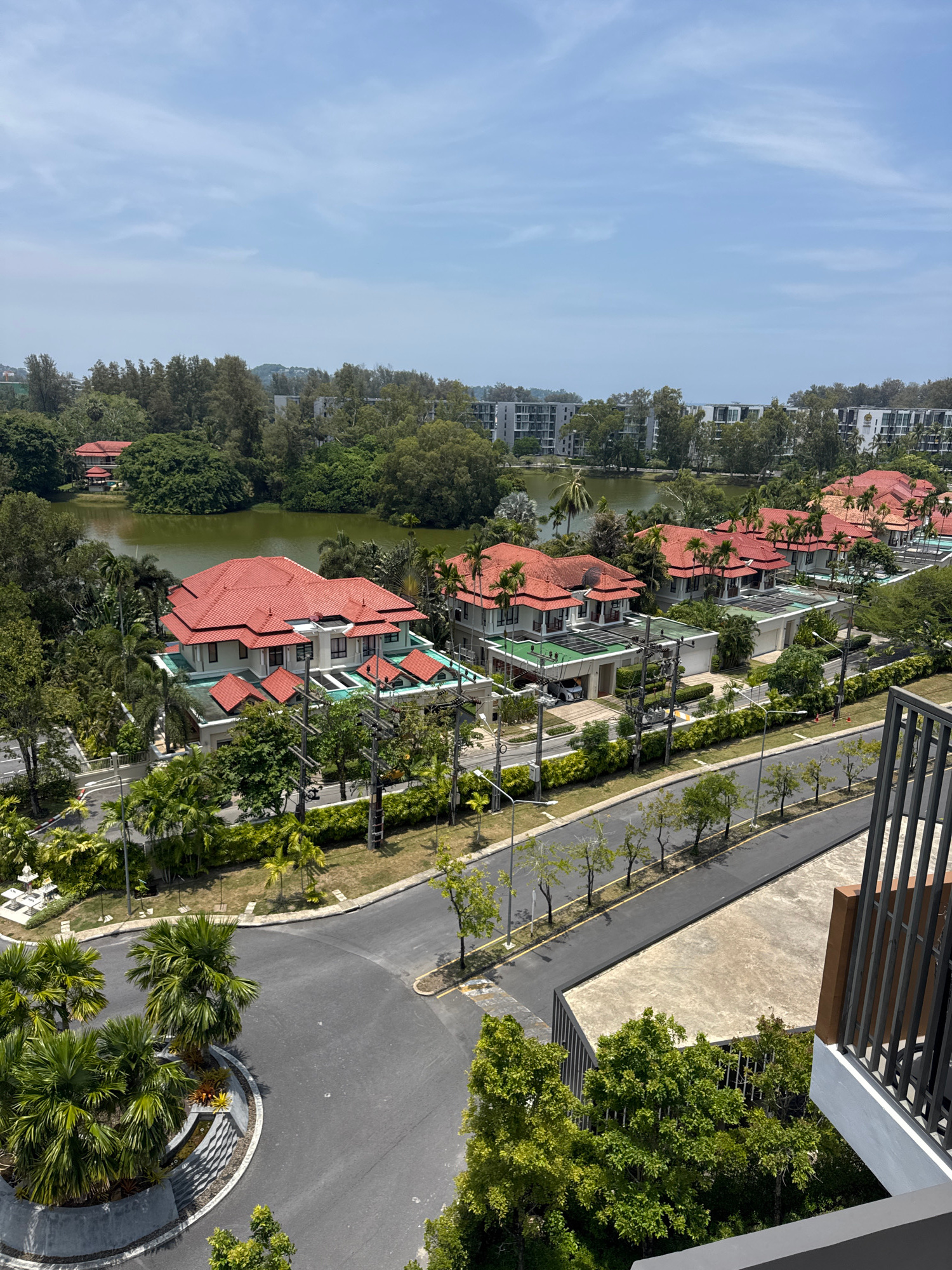An aerial view shows houses with red tiled roofs lining a lake. A road runs parallel to the houses, with palm trees and other trees planted along the roadside. The sky is light blue with scattered clo…read more