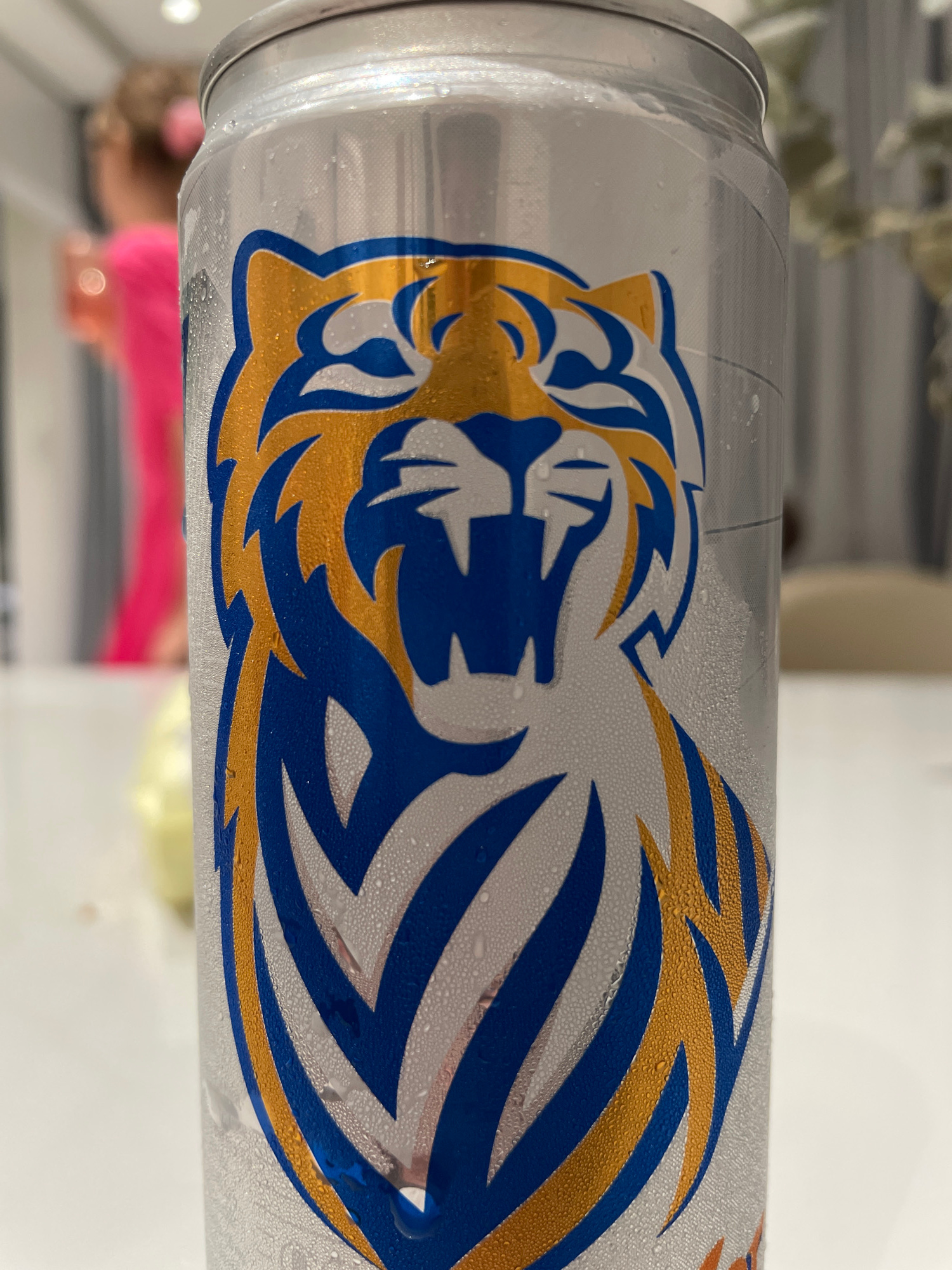 The primary subject of the image is a close-up, horizontally oriented shot of a silver beverage can covered in condensation, indicating it is cold. The can features a prominent, stylized graphic desig…read more