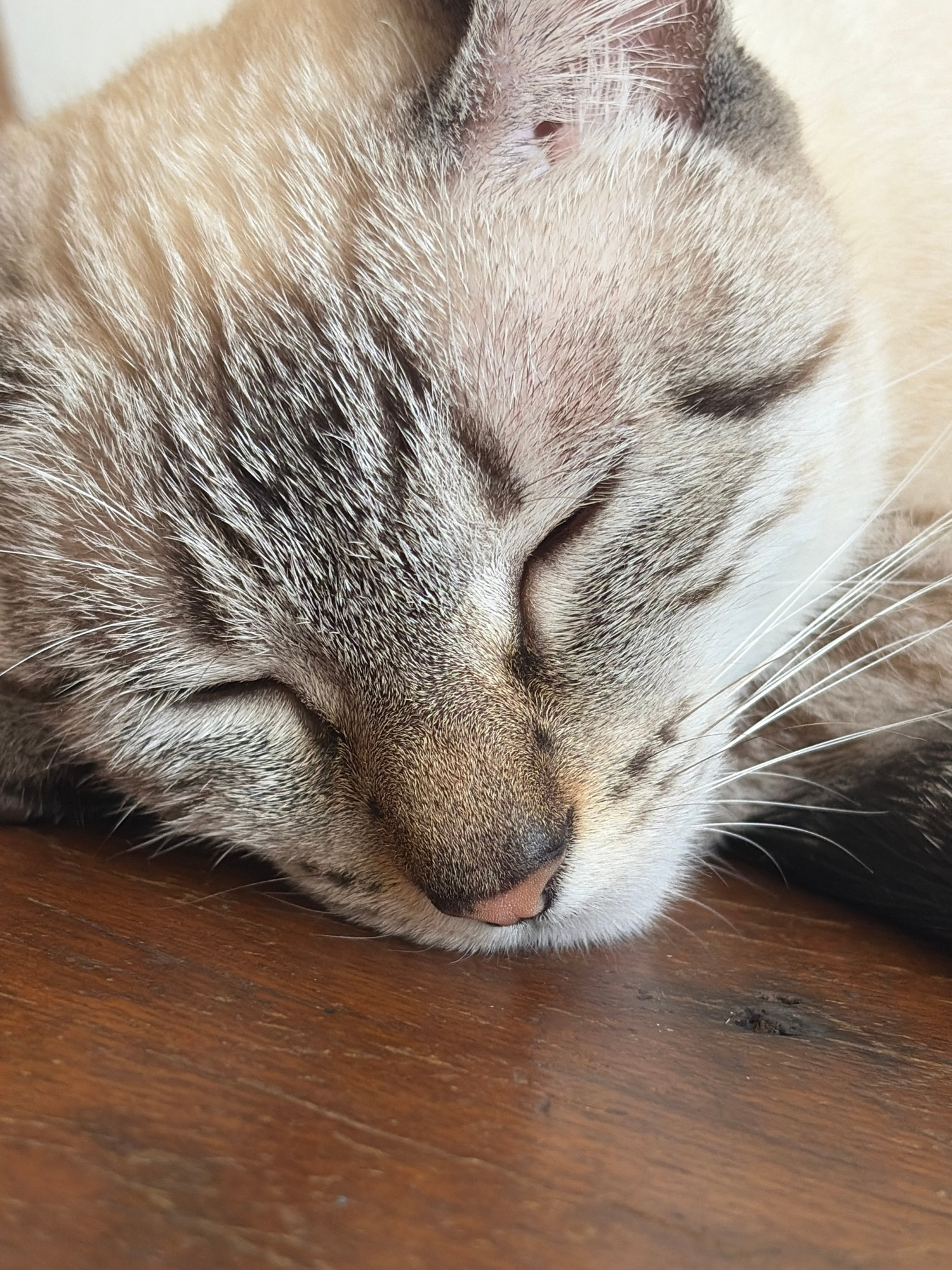 A close-up photograph shows the head of a sleeping cat resting on a wooden surface. The cat has light gray and beige fur with darker gray stripes, particularly visible on its forehead. Its eyes are cl…read more