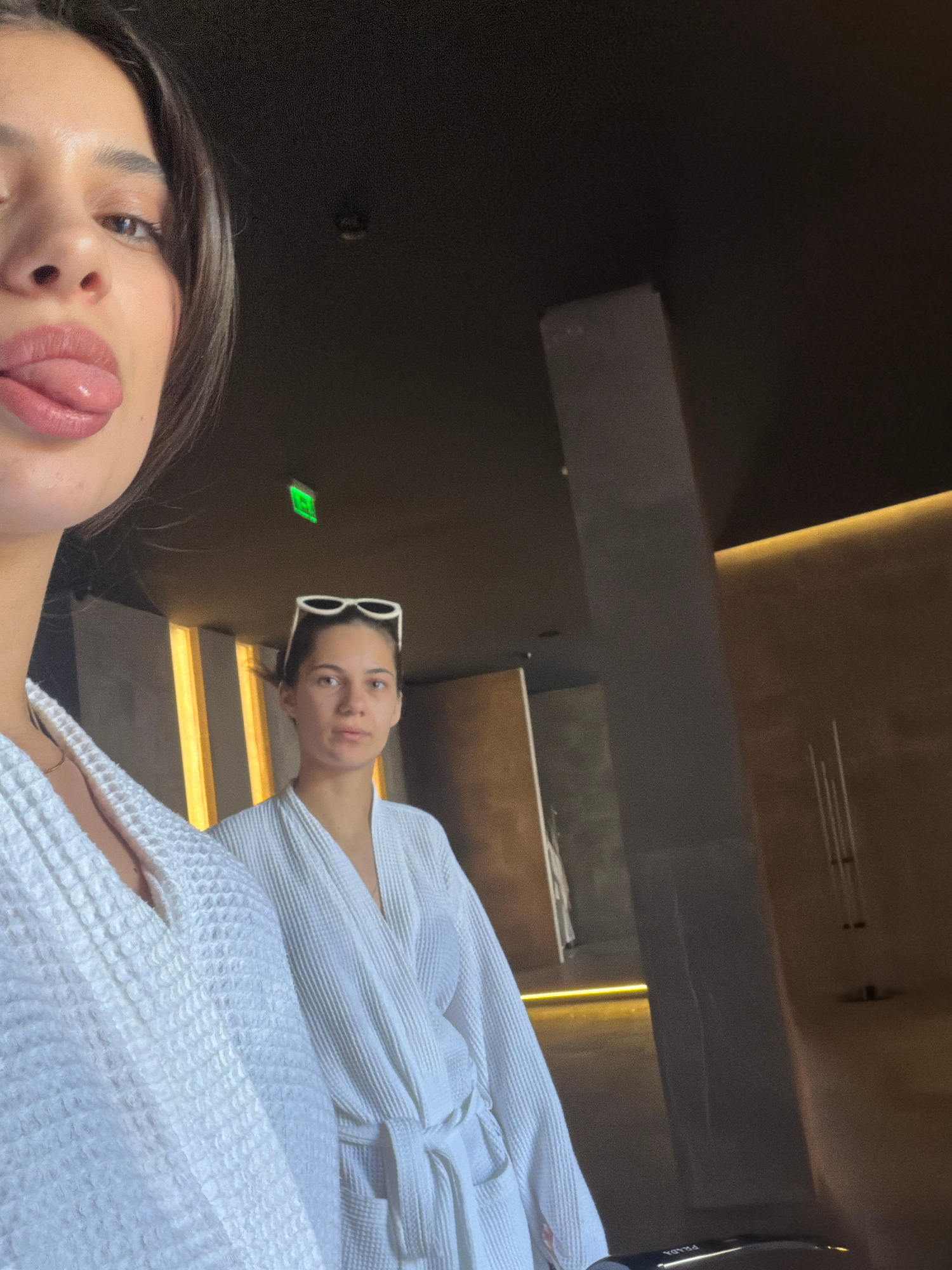 Two women wearing white robes are posing for a selfie. The location appears to be indoors, possibly a spa or relaxation area, in the city of Bania, Bulgaria. One of the women is holding the camera clo…read more