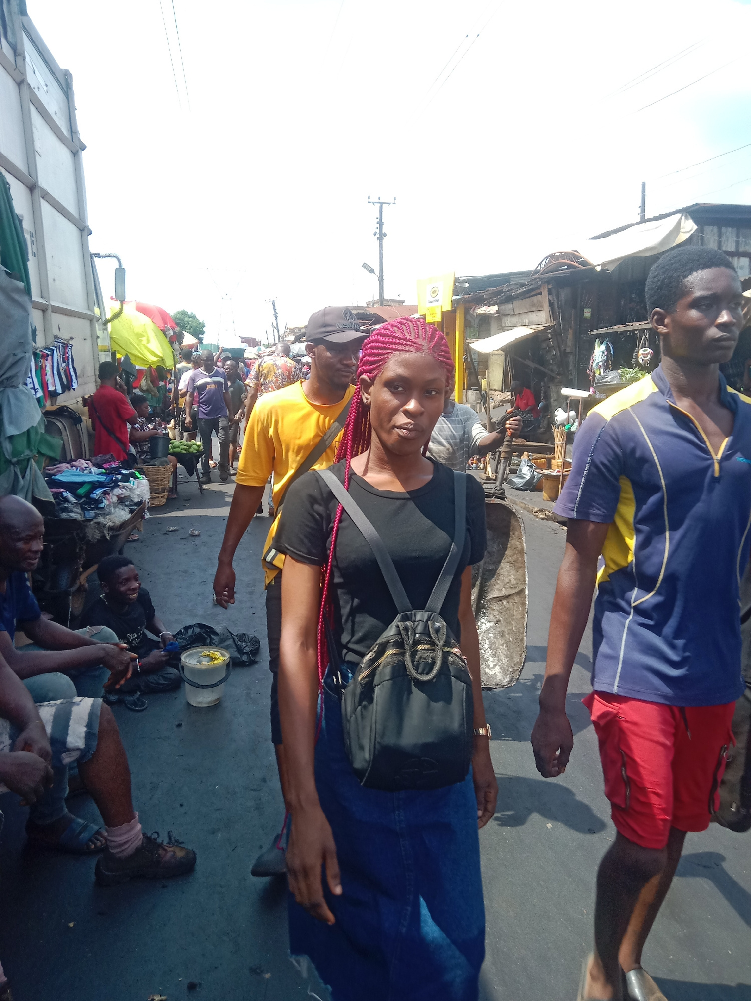 This vertical full shot captures a bustling, sunlit street market scene in Onitsha, Nigeria. In the immediate foreground, a woman with striking reddish-pink braided hair, wearing a black t-shirt, blue…read more