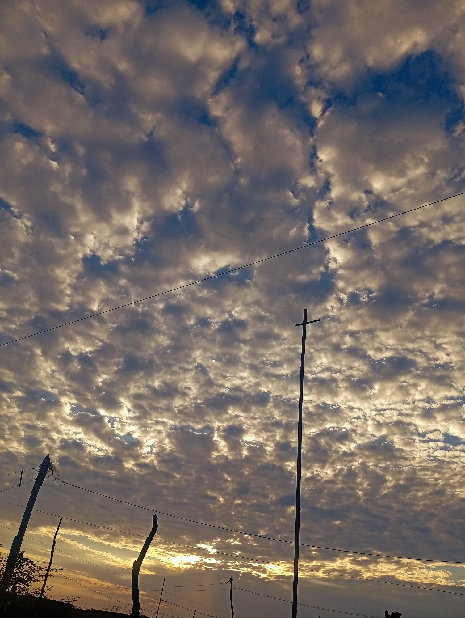 The image depicts a view of the sky in Altagracia, Venezuela. The sky is filled with altocumulus clouds, with some blue sky visible. The clouds are illuminated by the setting sun, giving them a golden…read more