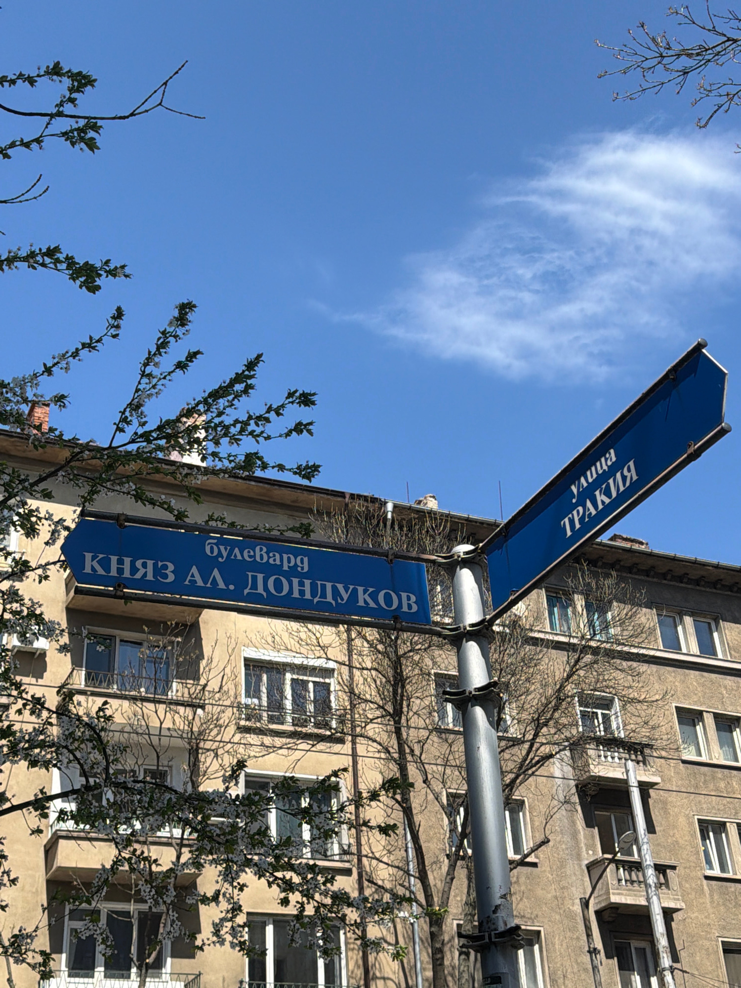 The image shows a street scene in Sofia, Bulgaria, featuring two blue street signs attached to a gray metal pole. The top sign reads "улица ТРАКИЯ" (ulitsa TRAKIYA), meaning "Trakia Street". The botto…read more