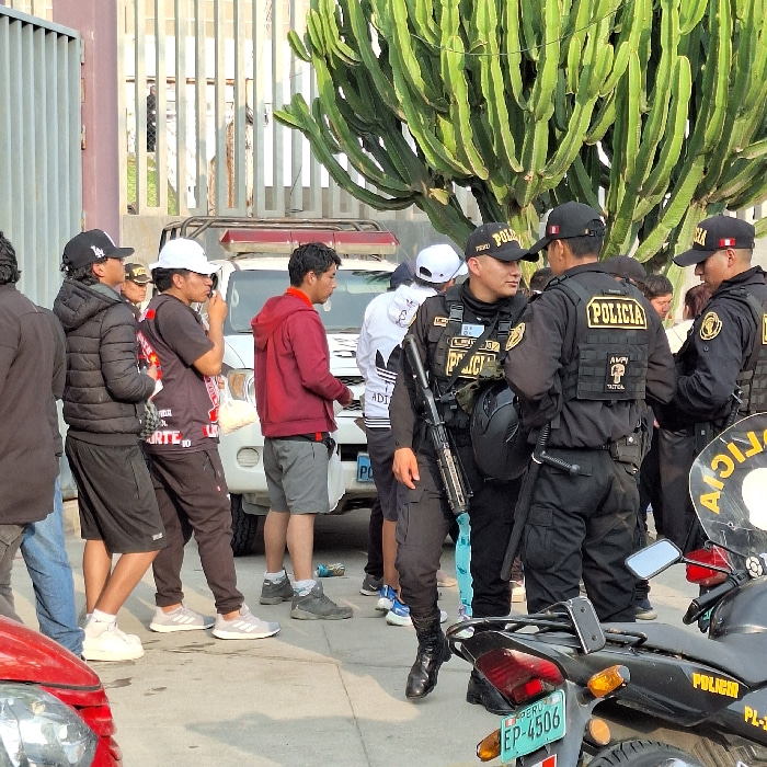A group of people stand on a street next to several Peruvian police officers in uniform, some with motorcycles. The officers wear tactical vests with "POLICIA" printed on them and helmets. One officerβ¦read more