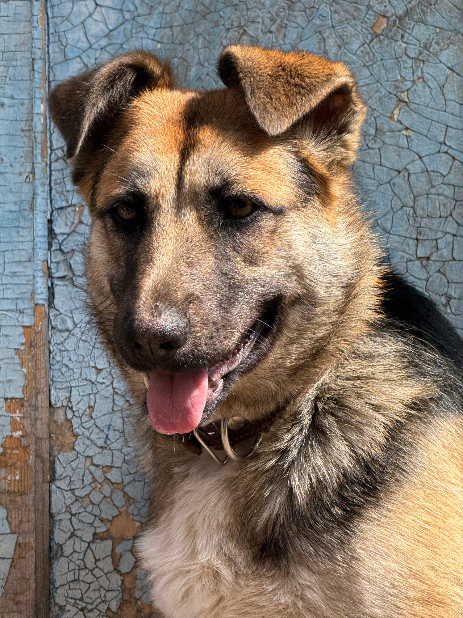 The image shows a medium-sized dog lying on a surface with cracked, peeling blue paint. The dog is mostly brown and tan with some black fur on its back and neck. It has floppy ears and is wearing a br…read more