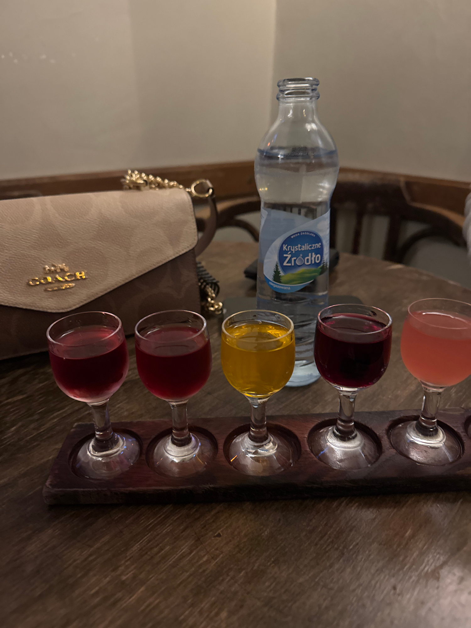 The image captures a scene from what appears to be a tasting event, likely in Krakow, Poland, given the presence of a bottle of "Krystaliczne Zrodlo" water, a Polish brand. On a wooden surface, a tast…read more