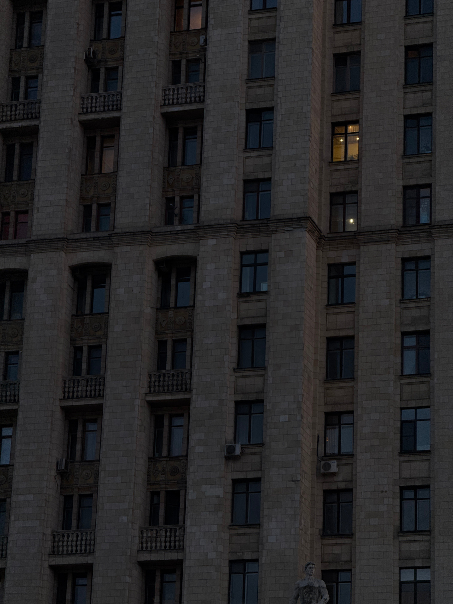 A low-angle, medium-shot photograph depicts a multi-story building at dusk. The building, located in Moscow, Russia, is made of beige bricks and features rows of windows. Most of the windows are dark,…read more