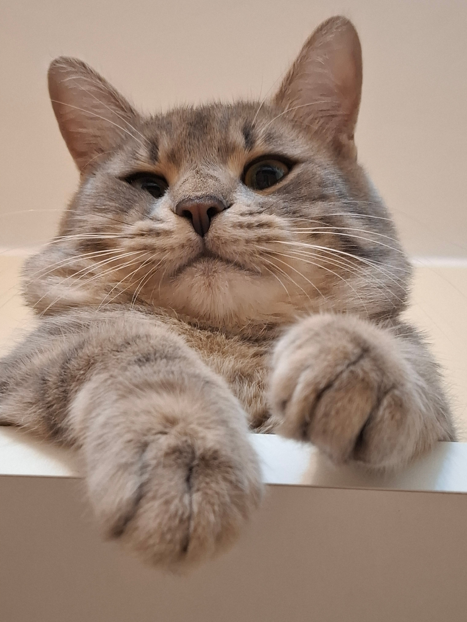 A silver tabby cat is peering down from above a white ledge. The cat's paws are visible over the edge. Its head is tilted slightly to the left. The location is unspecified and there is no indication o…read more