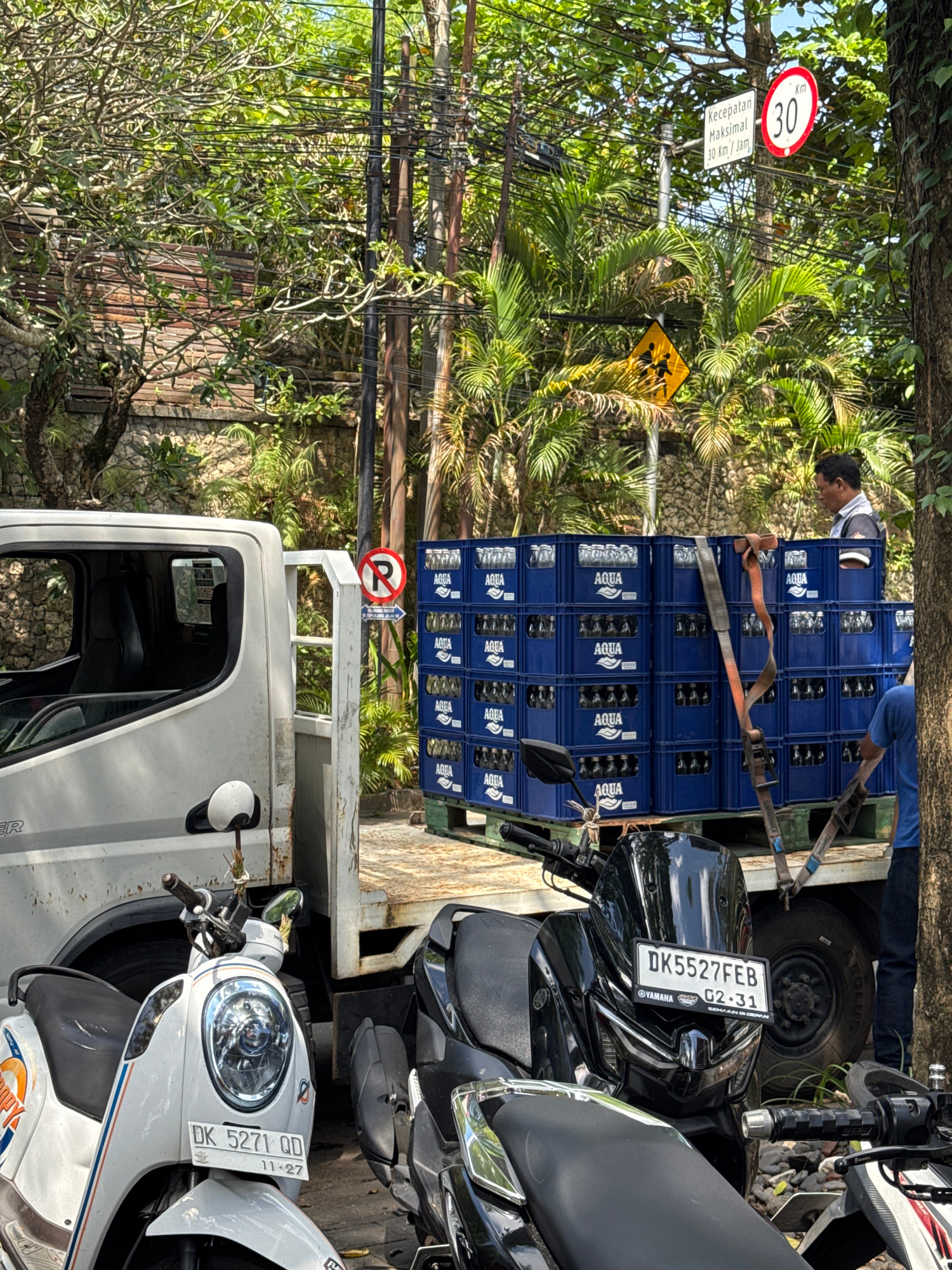 Here is a detailed description of the image: **Overview:** The image captures a street scene in Kuta Selatan, Indonesia. The scene is dominated by a white delivery truck loaded with stacks of blue Aq…read more