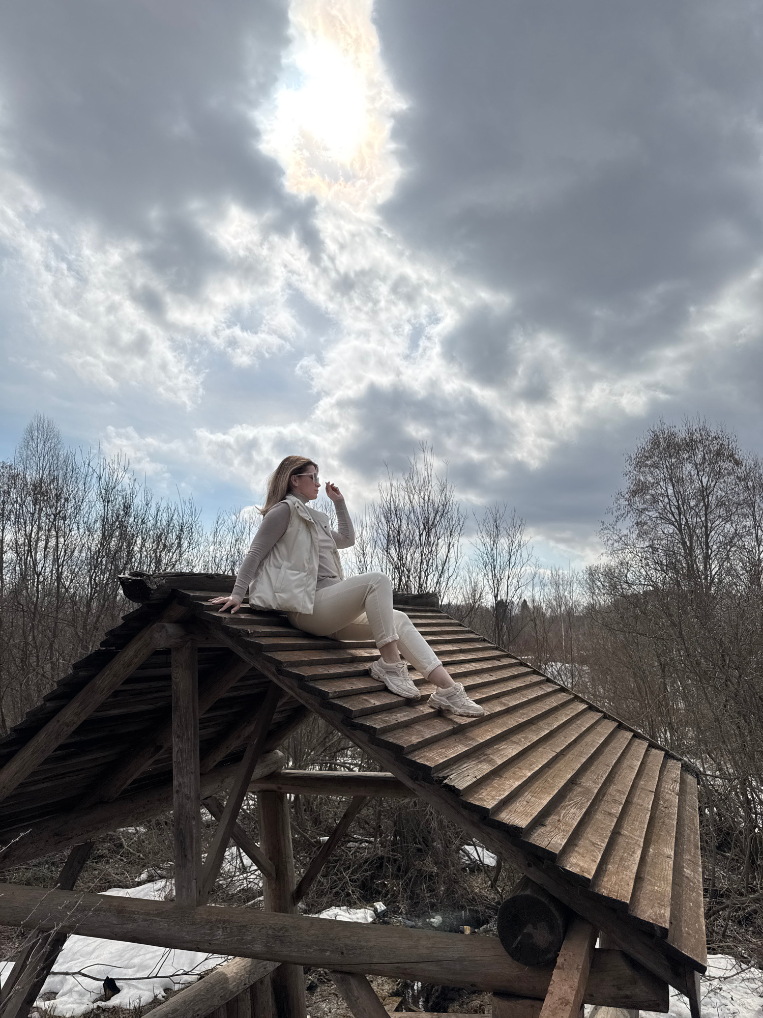 A woman is lying on a wooden structure. She is wearing a white vest and pants, and her legs are crossed at the ankles. The structure appears to be a shed or platform with a wooden roof. The background…read more