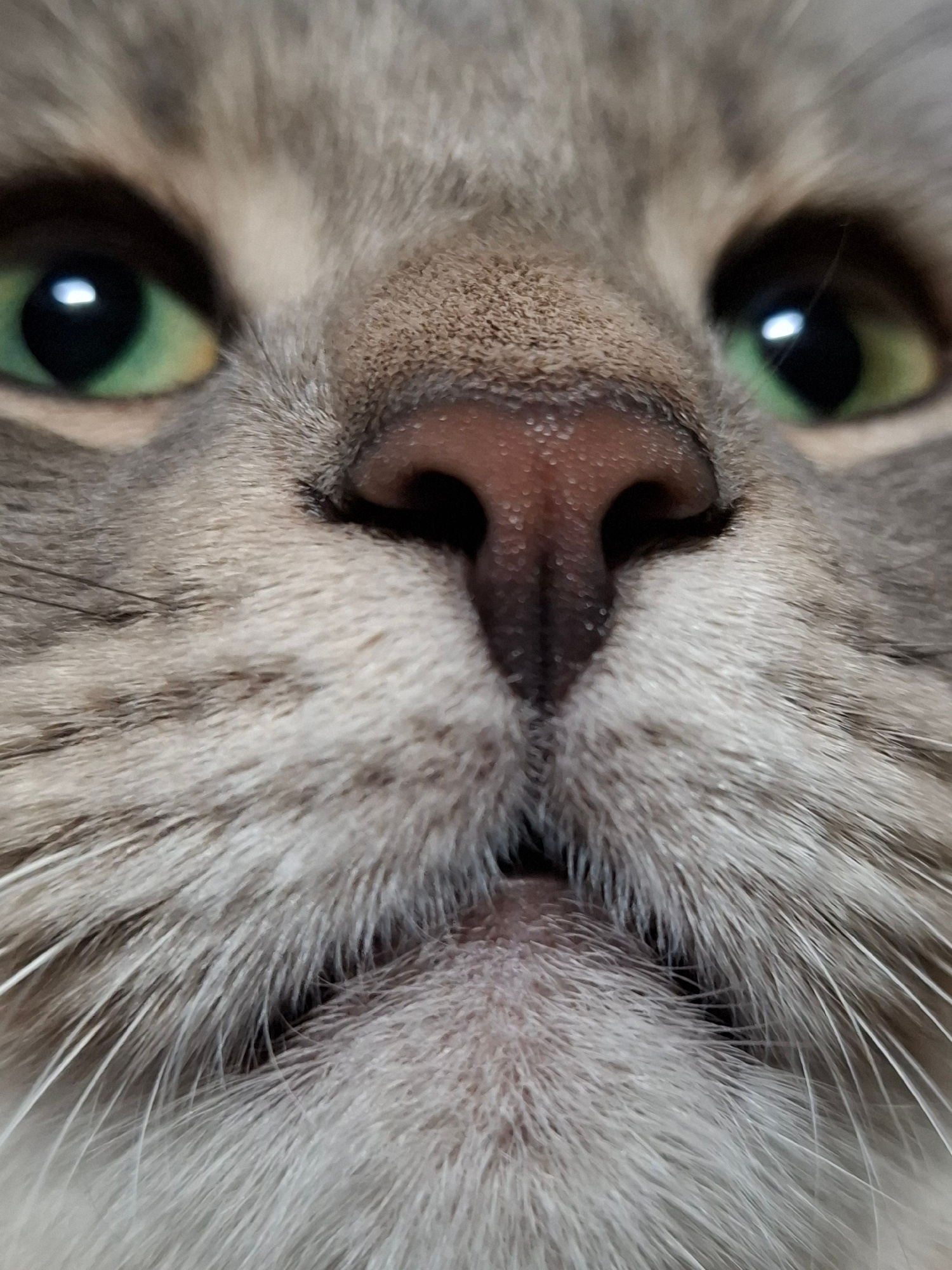 A close-up image shows the face of a gray tabby cat. The cat is upside down relative to the viewer. Visible features include green eyes with distinct pupils, a pink nose with dark edges and visible no…read more