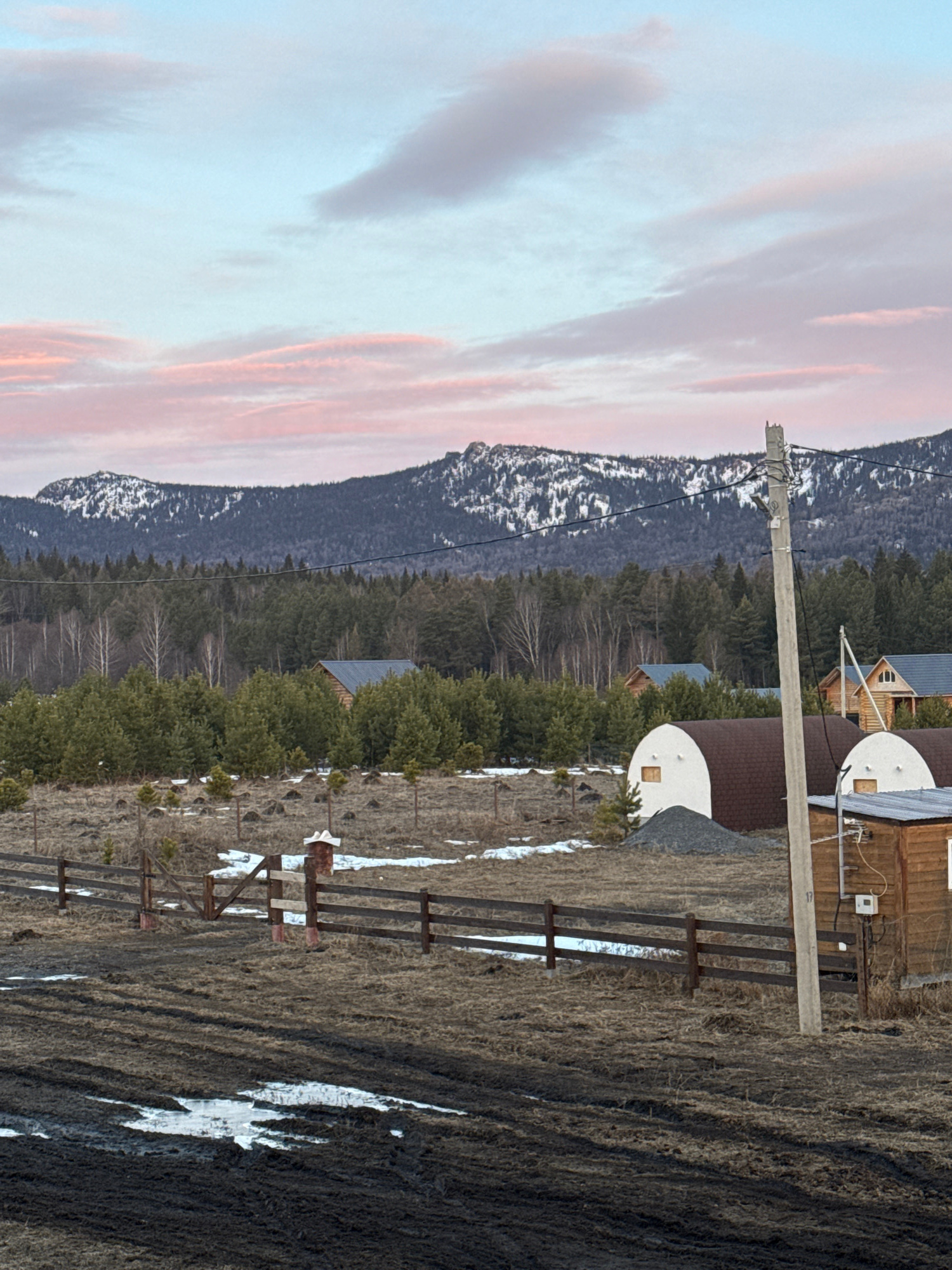 The scene depicts a rural landscape in Tyulyuk, Russia, under a sky exhibiting pink and light blue stratification with scattered clouds, indicative of twilight. In the background, jagged, snow-capped…read more