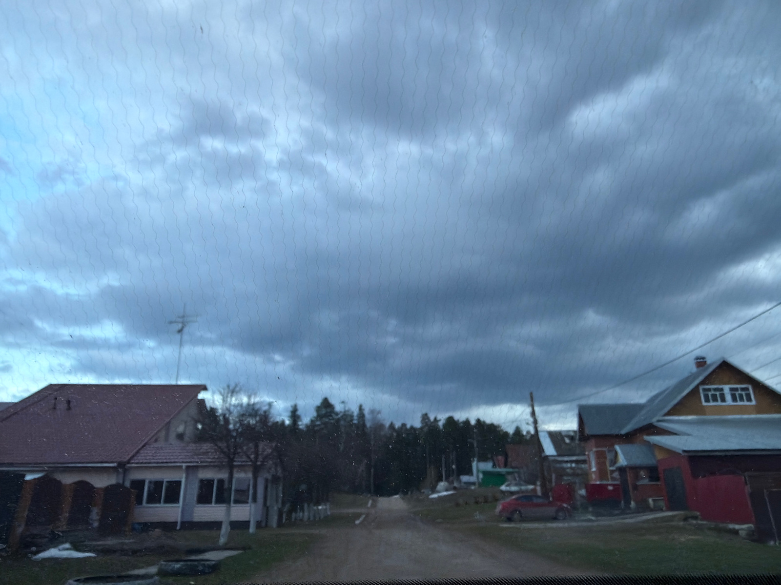 The image shows a view from inside a vehicle, looking out onto a rural street in Chaikovsky, Russia. The sky is heavily overcast with dark, stormy clouds. The road is unpaved. Houses line either side…read more