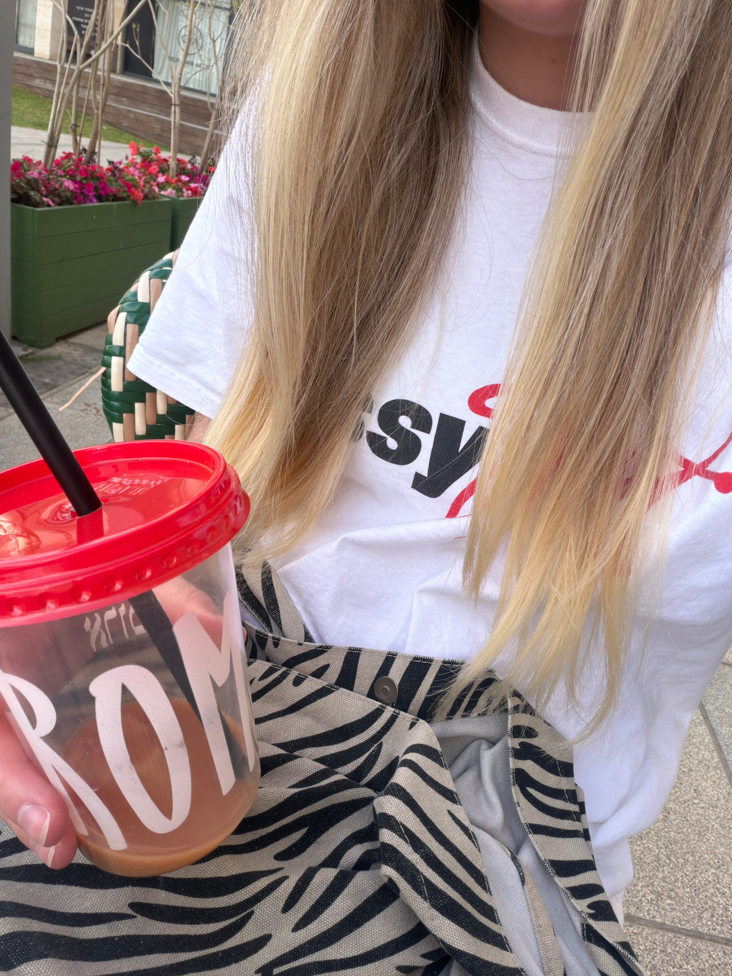 The image presents a close-up, downward-angled view of a person seated outdoors. The individual has long blonde hair and is wearing a white T-shirt with red and black graphic elements. A clear plasticβ¦read more