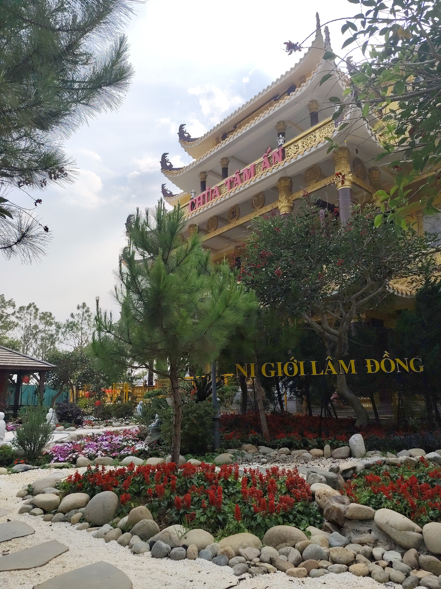 The image shows a building within the grounds of the Truc Lam Pagoda complex in Da Lat, Vietnam. The pagoda building is multi-tiered with a cream-colored exterior and gold trim, topped with decorative…read more