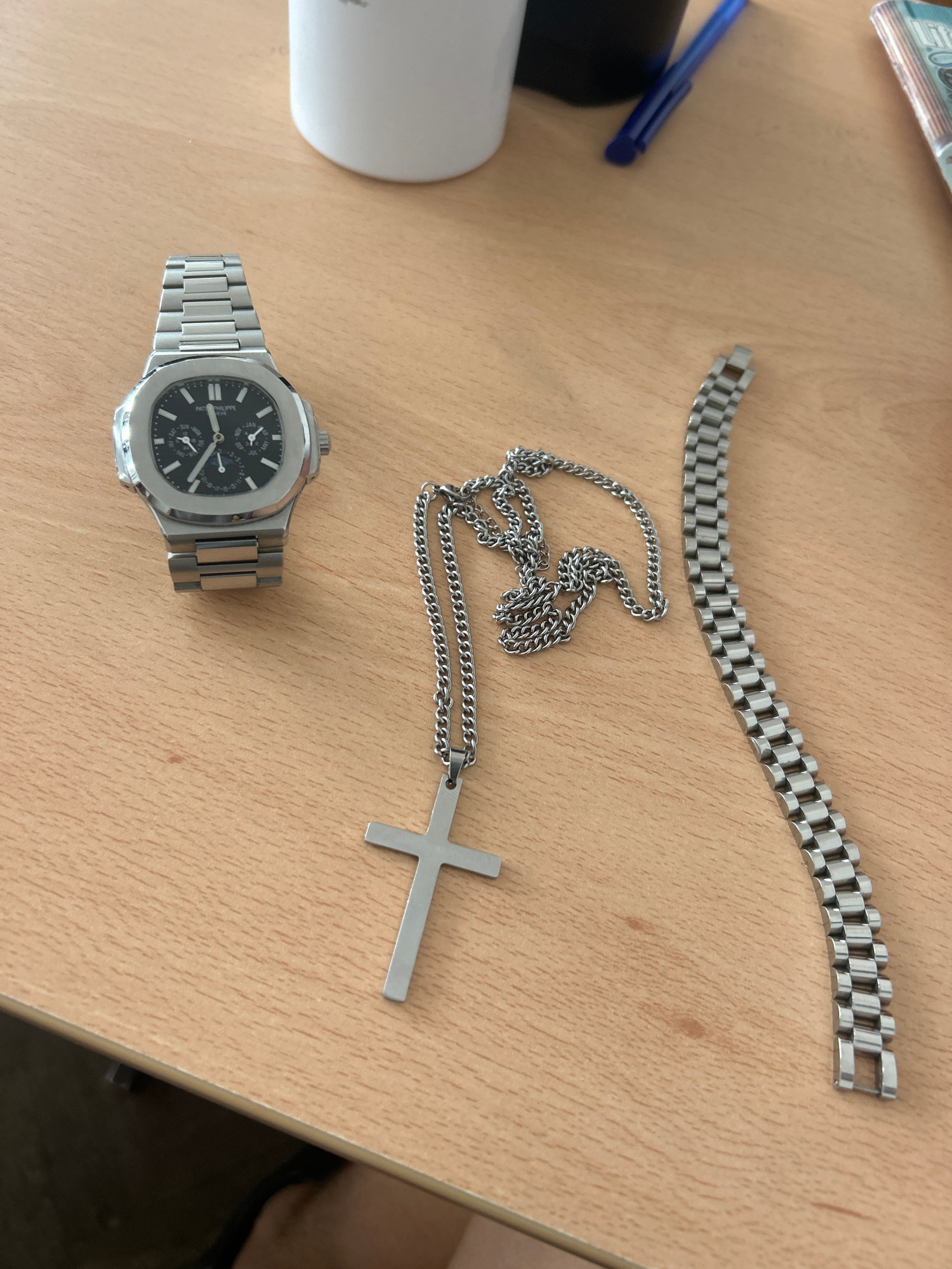The image shows a light brown wooden table on which are placed a silver watch, a silver chain with a cross pendant, a silver bracelet, a blue pen, and a white container. The watch is positioned at the…read more