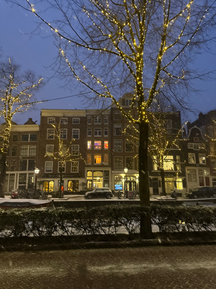 A winter scene showcases multi-story buildings with illuminated windows, suggesting apartments or businesses. Trees decorated with strings of small, warm lights frame the view. Falling snow creates a…read more